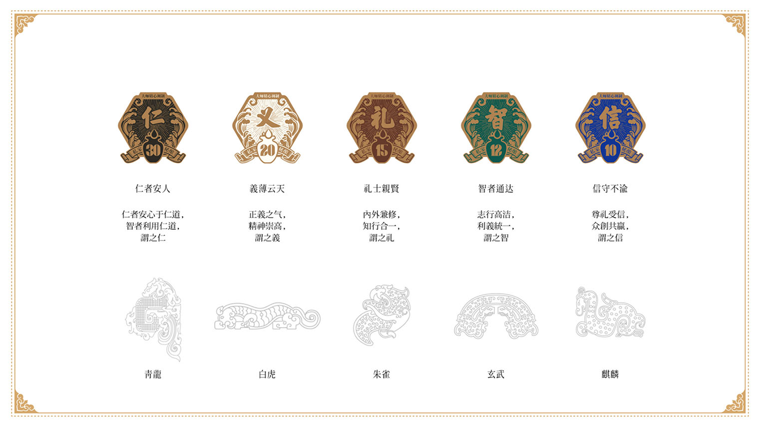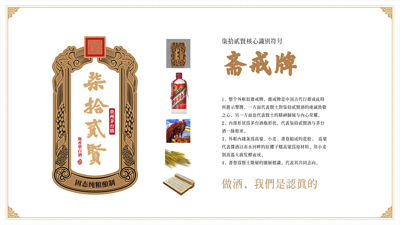 儒家精髓與酒業文明的完美(mei)碰撞。 充分利(li)用中國傳統裝飾紋(wen)樣——赤水河紋(wen),戒牌,五常壇(tan)作為差異化識別符號,賦予醬香酒更多的(de)文化內涵。