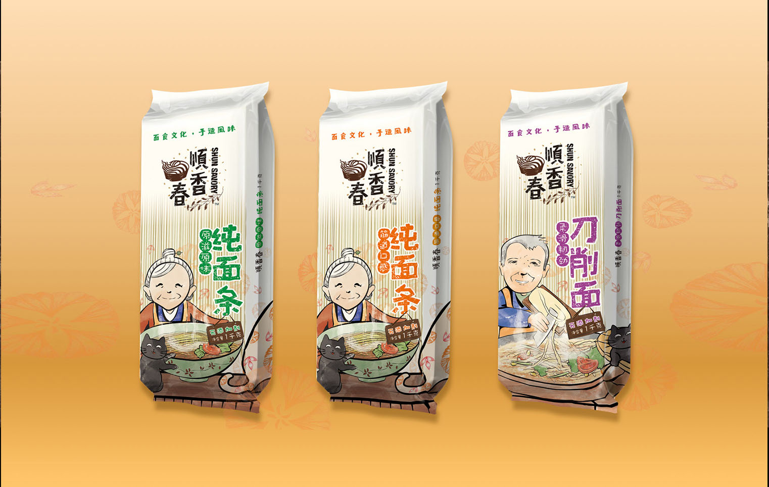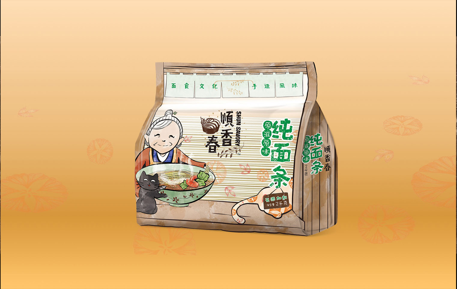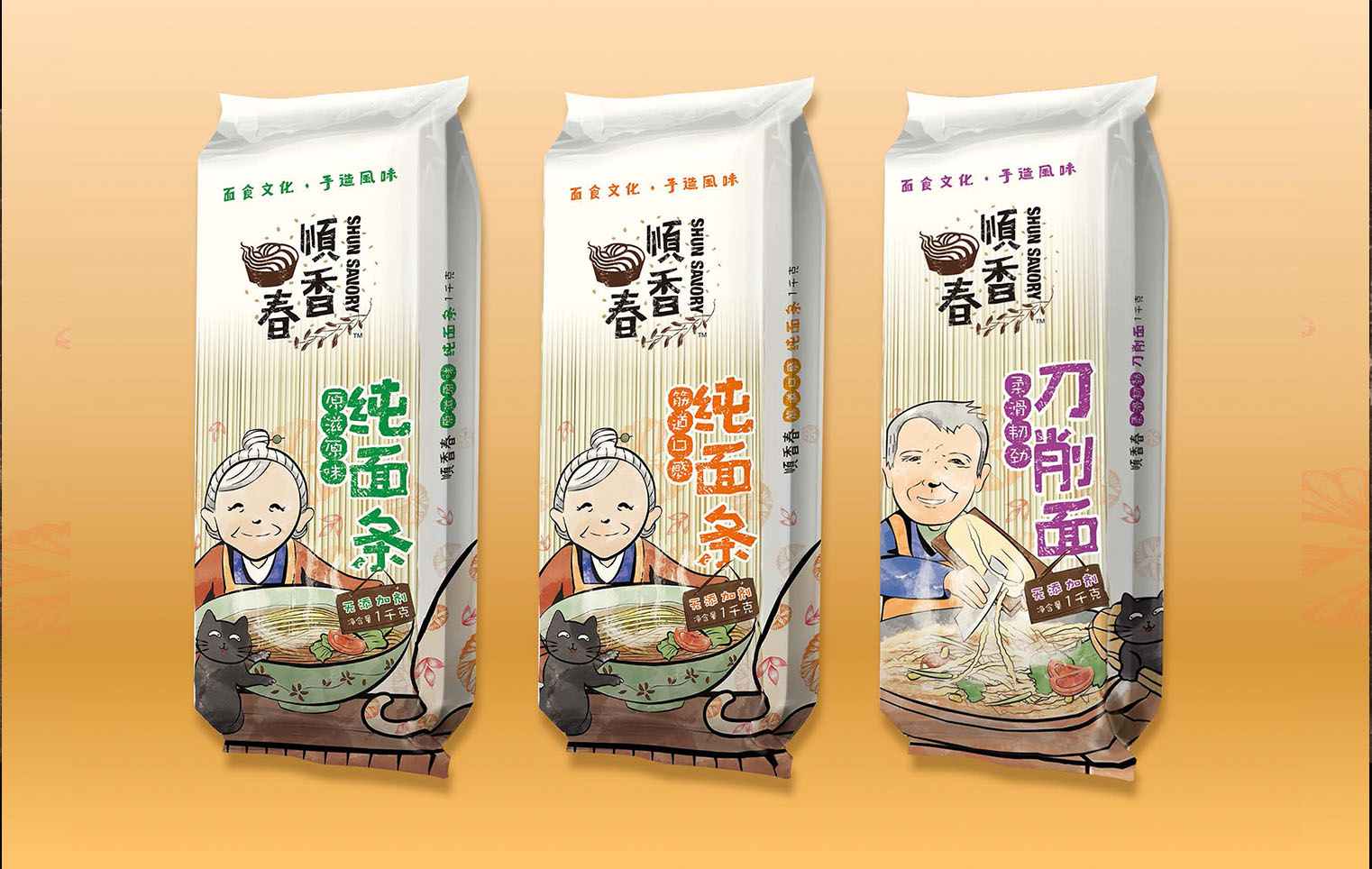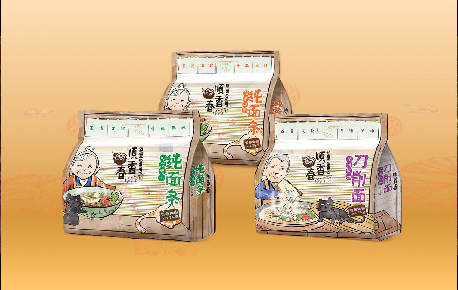 袋裝面,用手繪的(de)(de)(de)(de)形式(shi)描繪出不同衣著(zhu)和不同表情的(de)(de)(de)(de)順香(xiang)春(chun)IP,順爺(ye)爺(ye)和順婆婆,兩個貓咪(mi)為整個畫(hua)面的(de)(de)(de)(de)生動增添幾分趣味(wei)性。多款面條(tiao)擺(bai)在一起,設(she)計需要通(tong)過技巧讓消(xiao)費(fei)者(zhe)容易辨認(ren)產(chan)品的(de)(de)(de)(de)特性然后再引導消(xiao)費(fei)者(zhe)購買,所以設(she)計用明(ming)顯(xian)的(de)(de)(de)(de)不同配色和不同的(de)(de)(de)(de)碗和面條(tiao)的(de)(de)(de)(de)搭(da)配融合(he)成一個畫(hua)面,每(mei)個畫(hua)面都(dou)具(ju)有獨特性。
