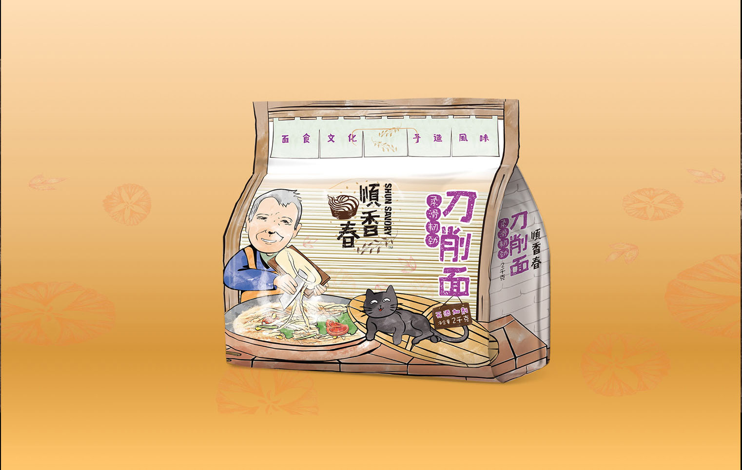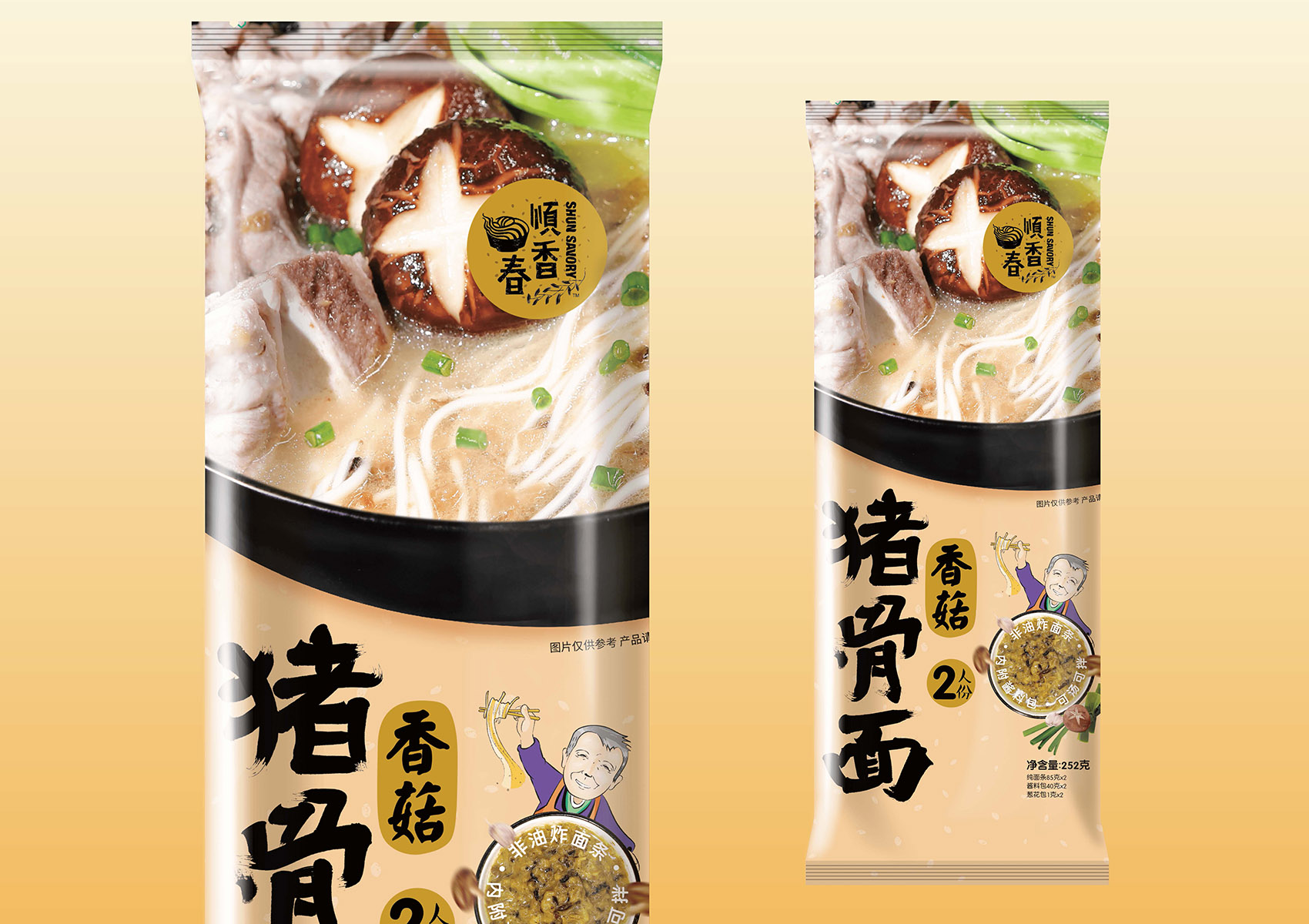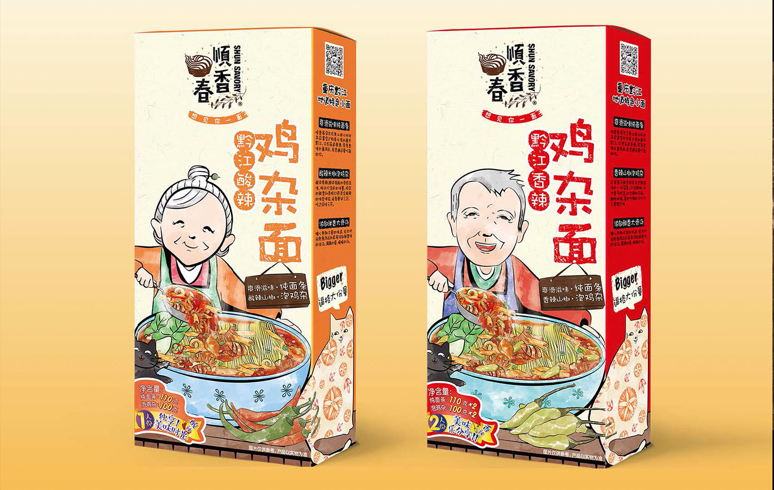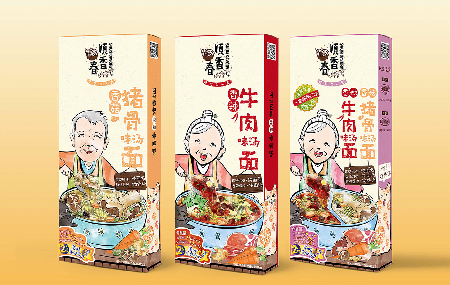 袋裝面,用手繪的(de)(de)(de)(de)形式(shi)描繪出不同衣著(zhu)和不同表情的(de)(de)(de)(de)順香(xiang)春(chun)IP,順爺(ye)爺(ye)和順婆婆,兩個貓咪(mi)為整個畫(hua)面的(de)(de)(de)(de)生動增添幾分趣味(wei)性。多款面條(tiao)擺(bai)在一起,設(she)計需要通(tong)過技巧讓消(xiao)費(fei)者(zhe)容易辨認(ren)產(chan)品的(de)(de)(de)(de)特性然后再引導消(xiao)費(fei)者(zhe)購買,所以設(she)計用明(ming)顯(xian)的(de)(de)(de)(de)不同配色和不同的(de)(de)(de)(de)碗和面條(tiao)的(de)(de)(de)(de)搭(da)配融合(he)成一個畫(hua)面,每(mei)個畫(hua)面都(dou)具(ju)有獨特性。