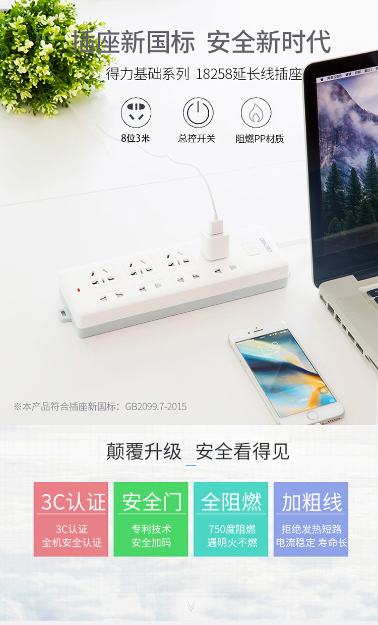 “deli/得力”18258 延長線插座 單個裝(白色新國標(biāo)安全插排插線板接線板排插拖線板總控開關(guān)兒童保護門8位3米)