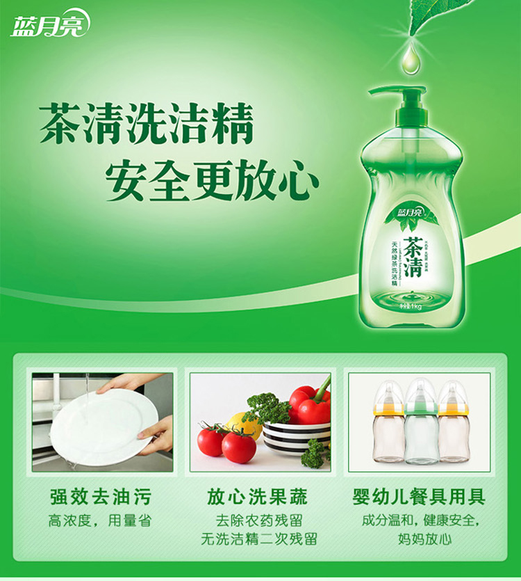 “藍(lán)月亮”茶清 1kg 天然綠茶洗潔精 單瓶裝(洗滌靈果蔬餐具清洗劑快速去油去農(nóng)殘?zhí)烊话踩珳睾筒粋?