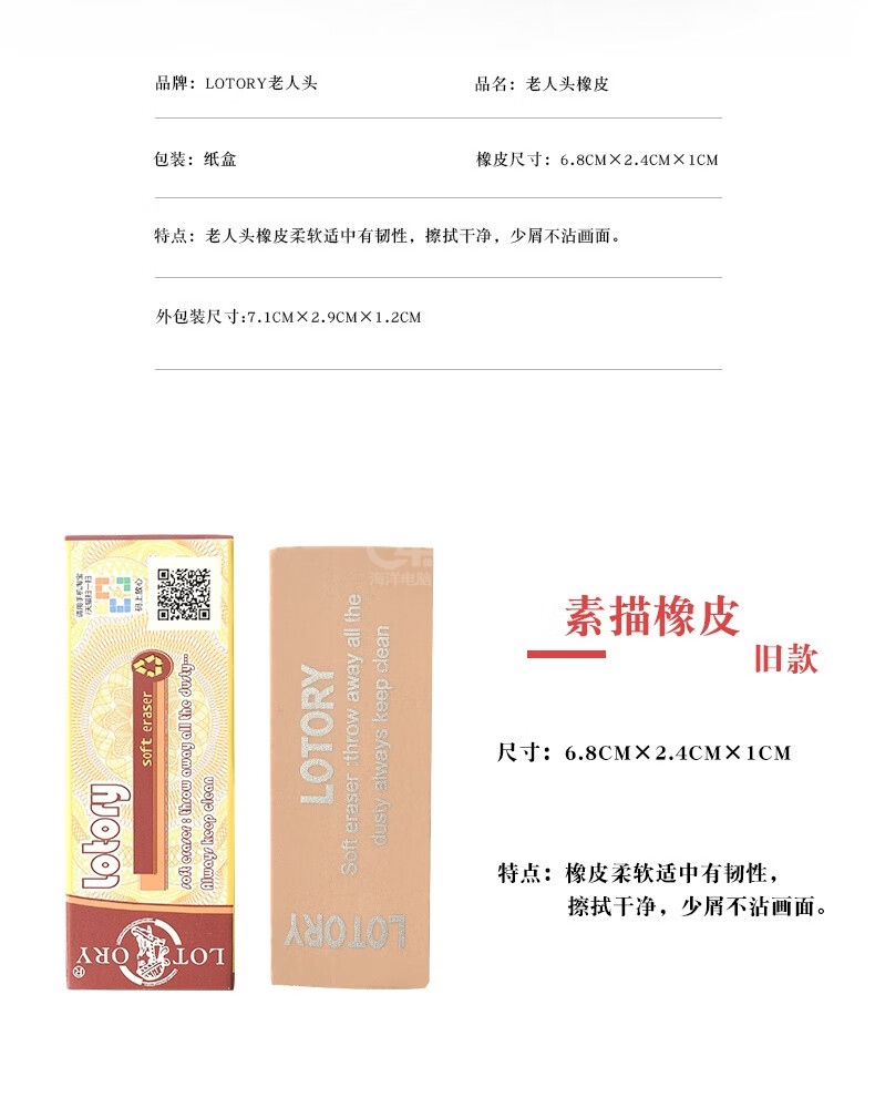 “LOTORY/老人頭”6.8cm*2.4cm*1cm 素描橡皮 1塊裝(雷尼繪畫橡皮美術(shù)橡皮擦48塊/盒)