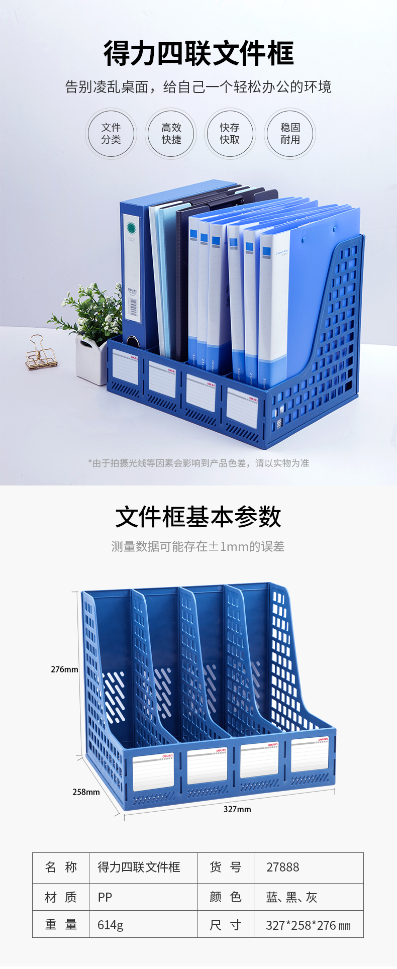 “deli/得力”No.27888 四聯(lián)文件框 單個(gè)裝(藍(lán)色鏤空桌面四欄帶標(biāo)簽穩(wěn)固文件架/文件欄/文件筐/資料框辦公用品)