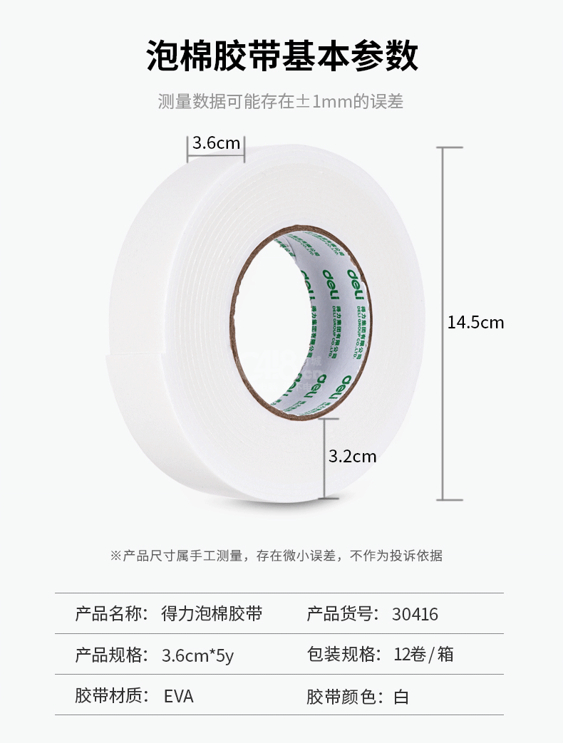 “deli/得力”No.30416 雙面泡棉膠帶 單卷裝(白色2.5mm*36mm*5y加粘粘性雙面膠EVA海綿膠12卷/箱)