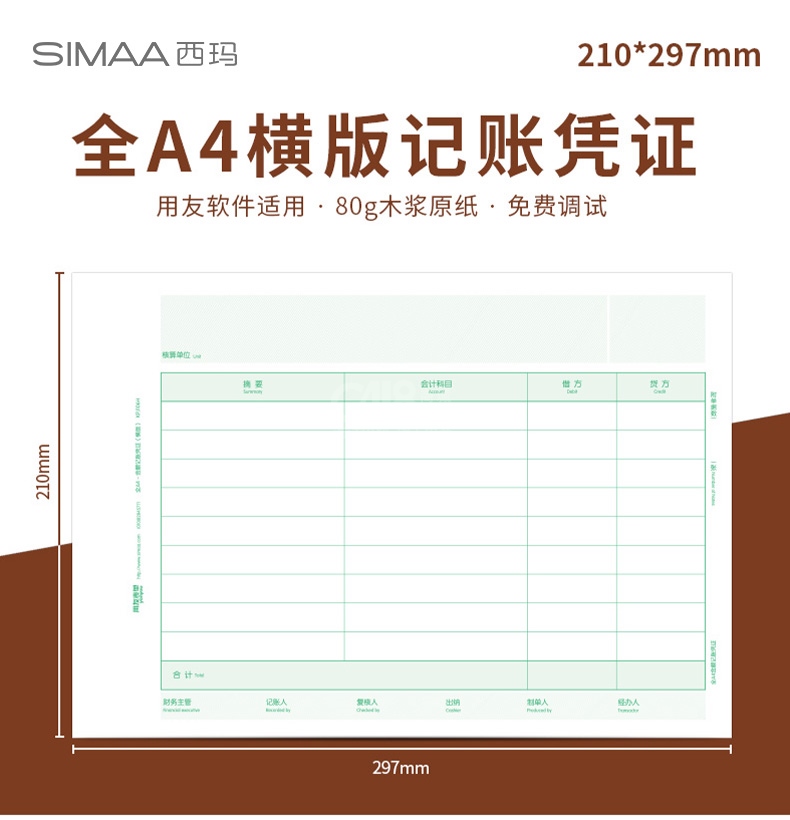 “SIMAA/西瑪”SKPJ106H A4金額記賬憑證 單箱裝(297*210mm橫版用友憑證激光打印紙500份/包2包/箱15351)