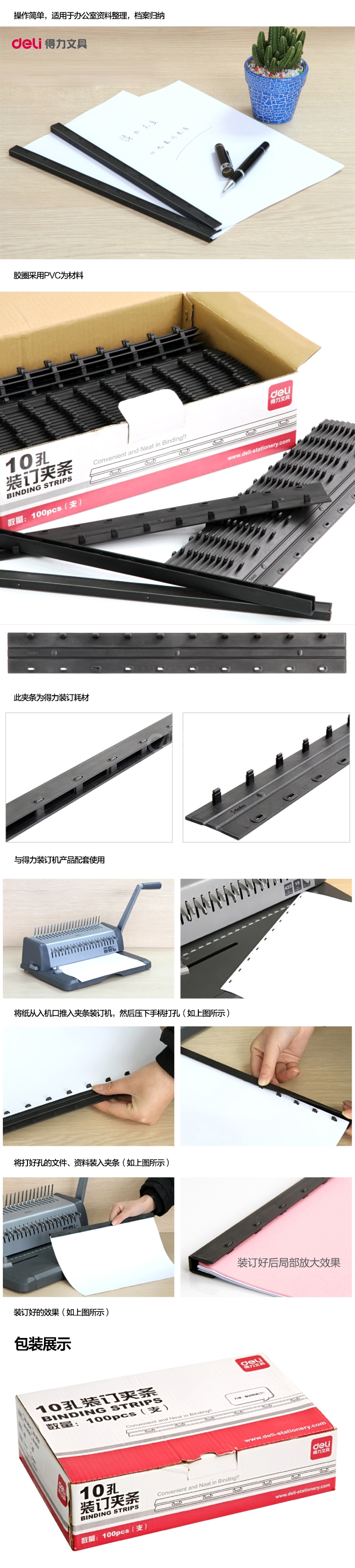 “deli/得力”No.3828 10孔裝訂夾條 1盒裝(黑色A4塑料十孔標書文件裝訂機夾邊條300*12.5mm 3828-10 100支/盒)