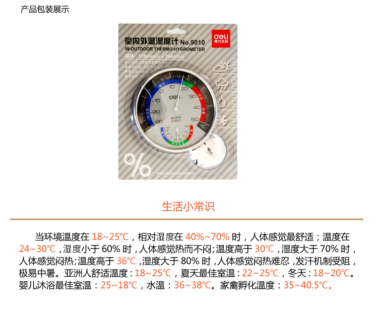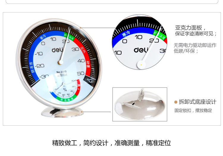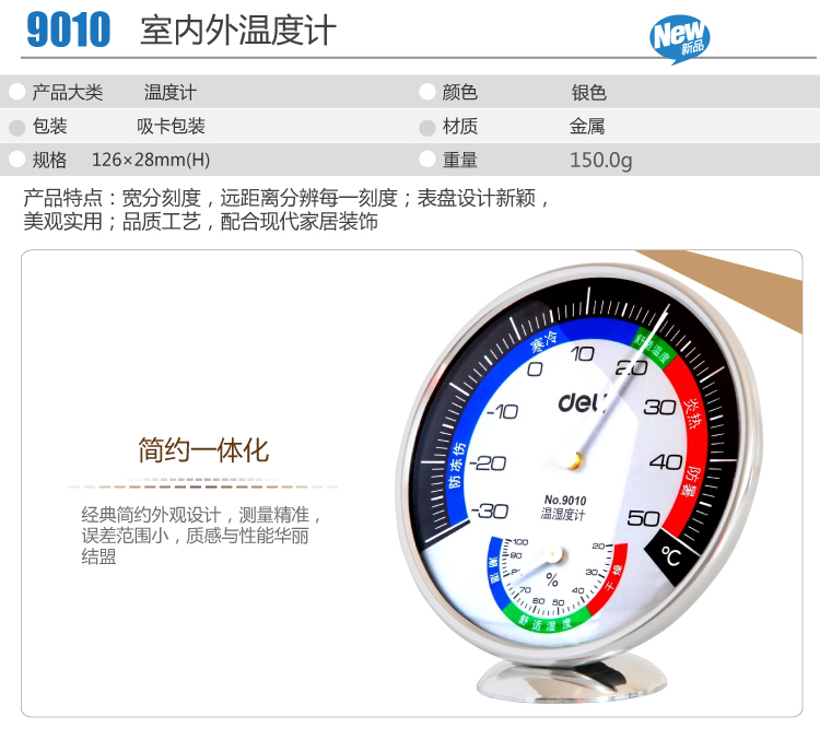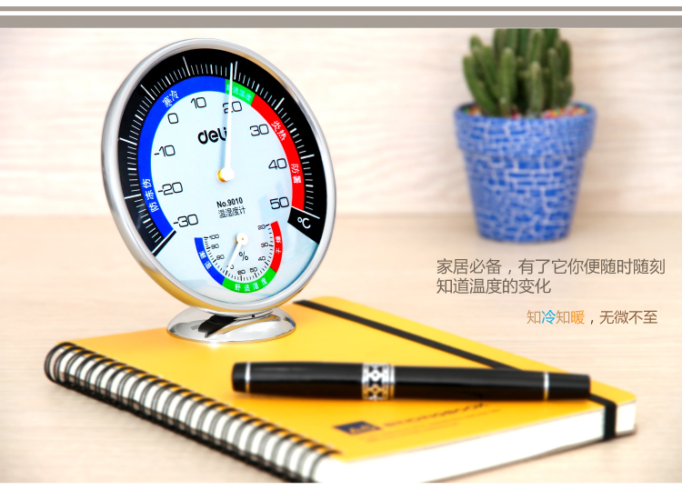 “deli/得力”No.9010 溫濕度計 單個裝(銀色大號辦公室內(nèi)外兩用測溫計防寒防暑時尚簡約溫度計)
