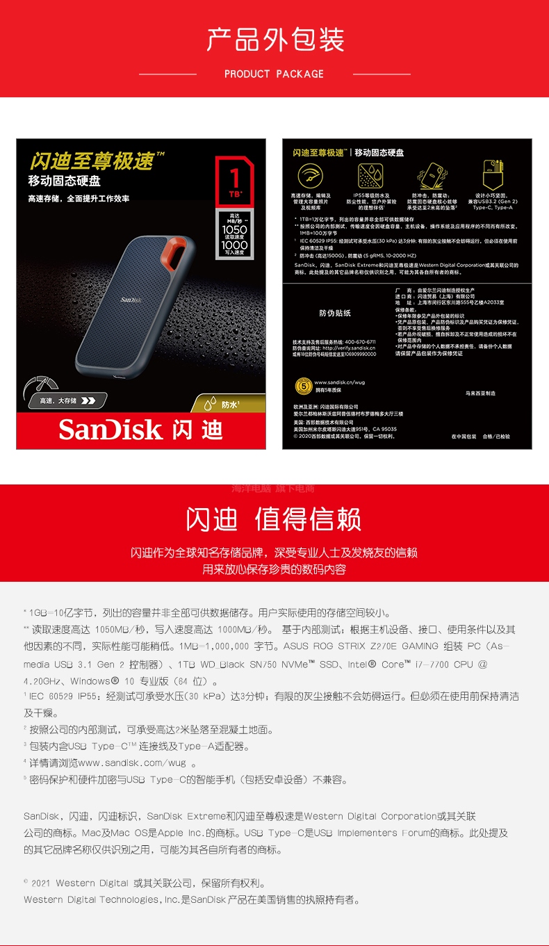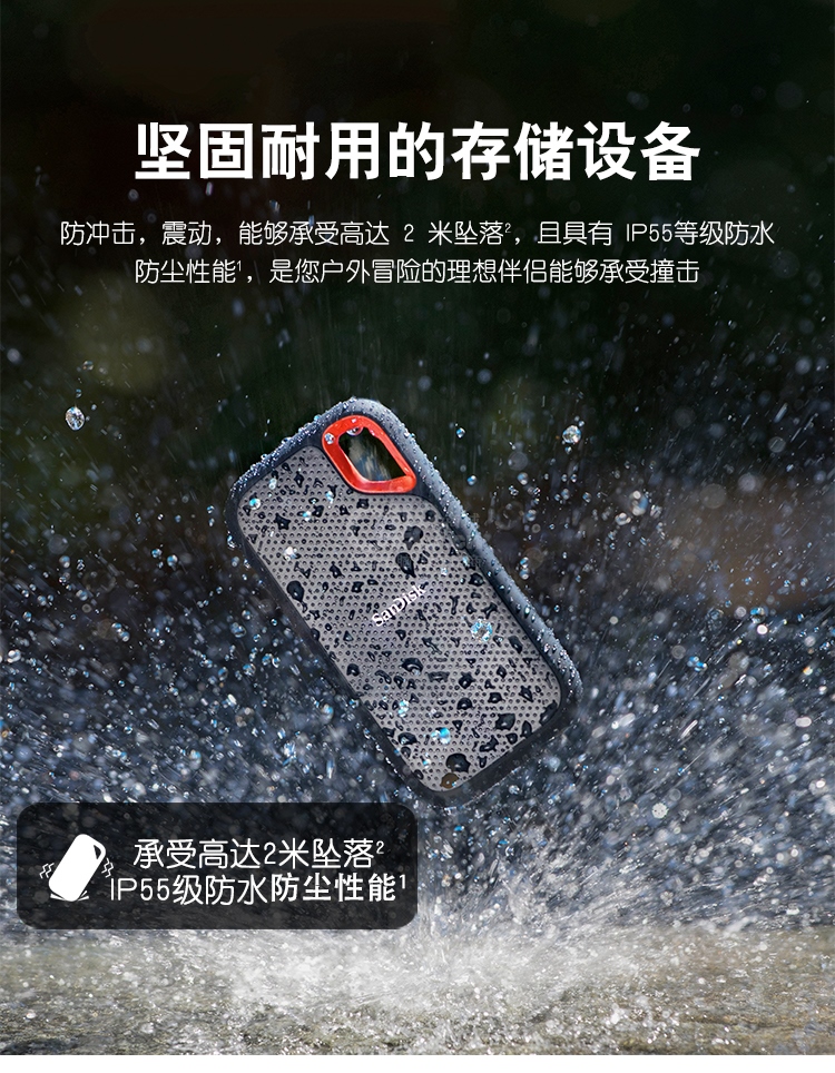 “SanDisk/閃迪”SDSSDE61-1T00-Z25 移動固態(tài)硬盤 單個裝(黑色1TB至尊極速卓越版E61傳輸速度1050MB/s IP55等級三防保護)