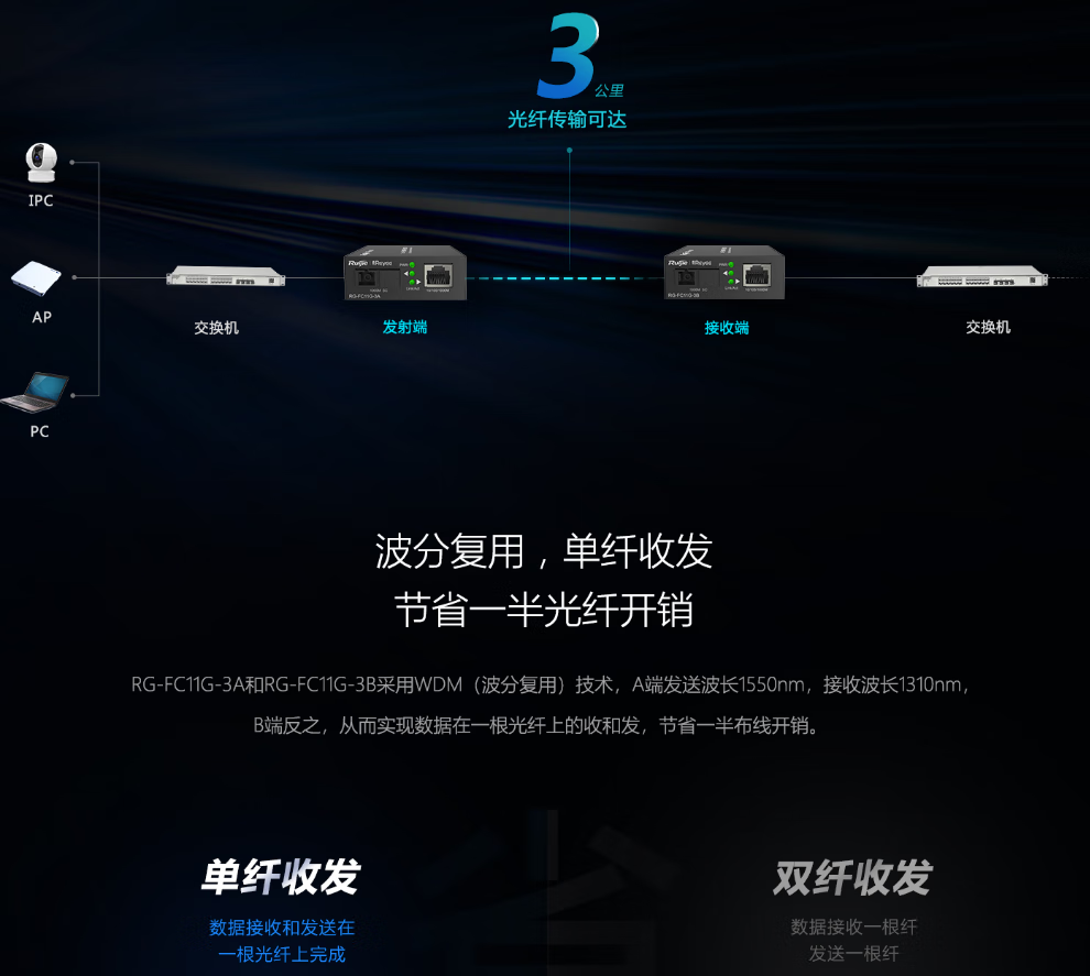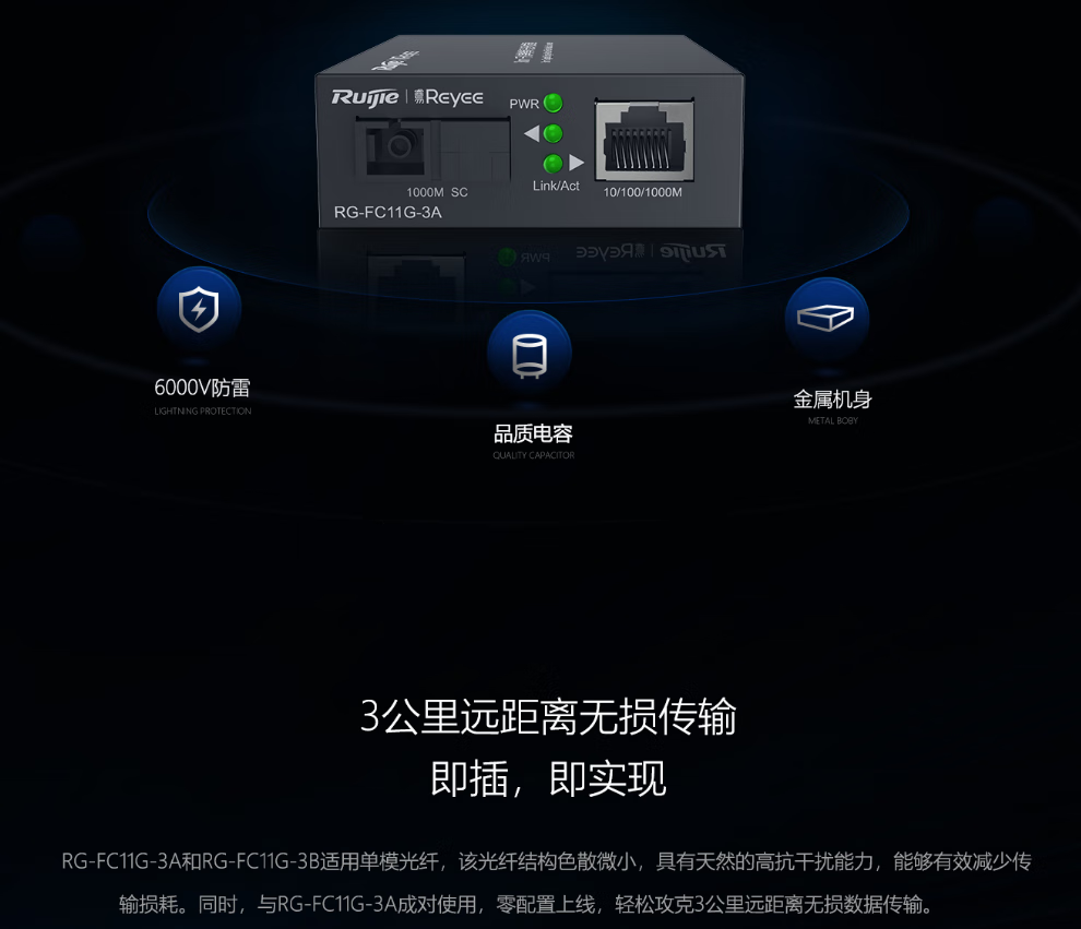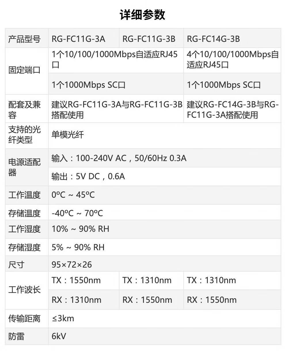 “Ruijie/銳捷”RG-FC14G-3B 光纖收發(fā)器 單臺(tái)裝(千兆單模單纖3公里B端)