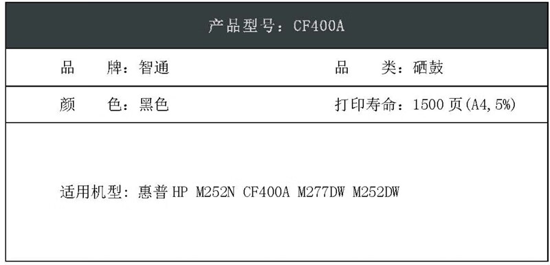 “ZT(kilter)/智通”CF400A 標準版 環(huán)保型激光碳粉盒 單個裝(黑色201A硒鼓帶芯片ZT-CF400A-B適用HP M252N CF400A M277DW M252DW)