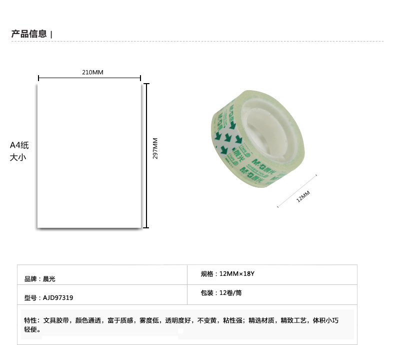 “M&G/晨光”AJD97319 文具膠帶 單筒裝(高透12*18y易撕便攜小膠帶16.5米/卷12卷/筒)