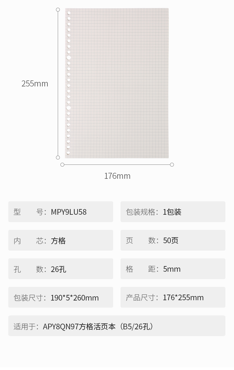 “M&G/晨光”MPY9LU58 活頁(yè)芯 單本裝(米色文具B5/26孔活頁(yè)本替芯記事本筆記本子極簡(jiǎn)系列5*5mm方格替換內(nèi)芯線圈紙50張/本)