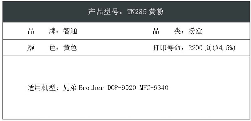 智通ZT TN285黃粉硒鼓 適用于:兄弟Brother DCP-9020 MFC-9340