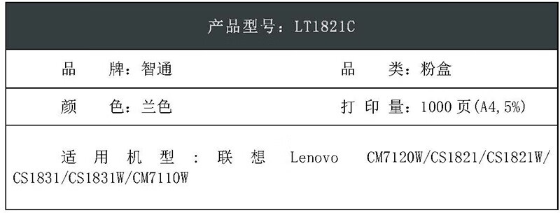 “ZT(kilter)/智通”LT 1821C 環(huán)保型激光碳粉盒 單個裝(青色LT1821C ZT-CS1821/LT1821-C-F適用聯(lián)想Lenovo CM7120W CS1821 CS1821W CS1831 CS1831W CM7110W)