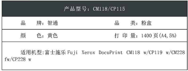 “ZT(kilter)/智通”CM118/CP115 激光碳粉盒 單個裝(黃色帶芯片墨粉筒適用富士施樂Fuji Xerox DocuPrint CM118 w CP119 w CM228 fw CP228 w)