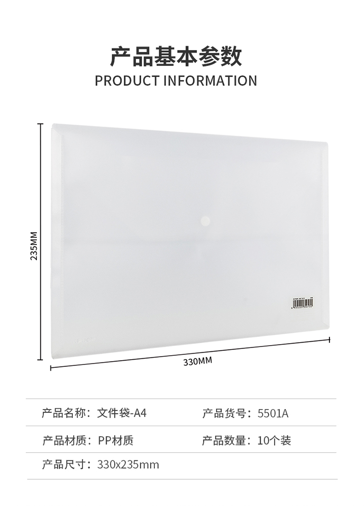 “deli/得力”No.5501A 文件袋 單包裝(A4加厚透明按扣資料袋防水檔案袋公文袋財(cái)務(wù)票據(jù)收納10只/包)