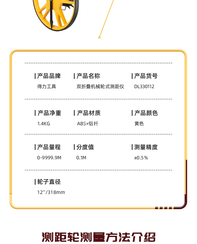 “deli/得力”DL330112 雙折疊機(jī)械輪式測(cè)距儀 單臺(tái)裝(300mm機(jī)械輪尺滾輪手推式滾尺高精度機(jī)械推尺室外測(cè)量工具)