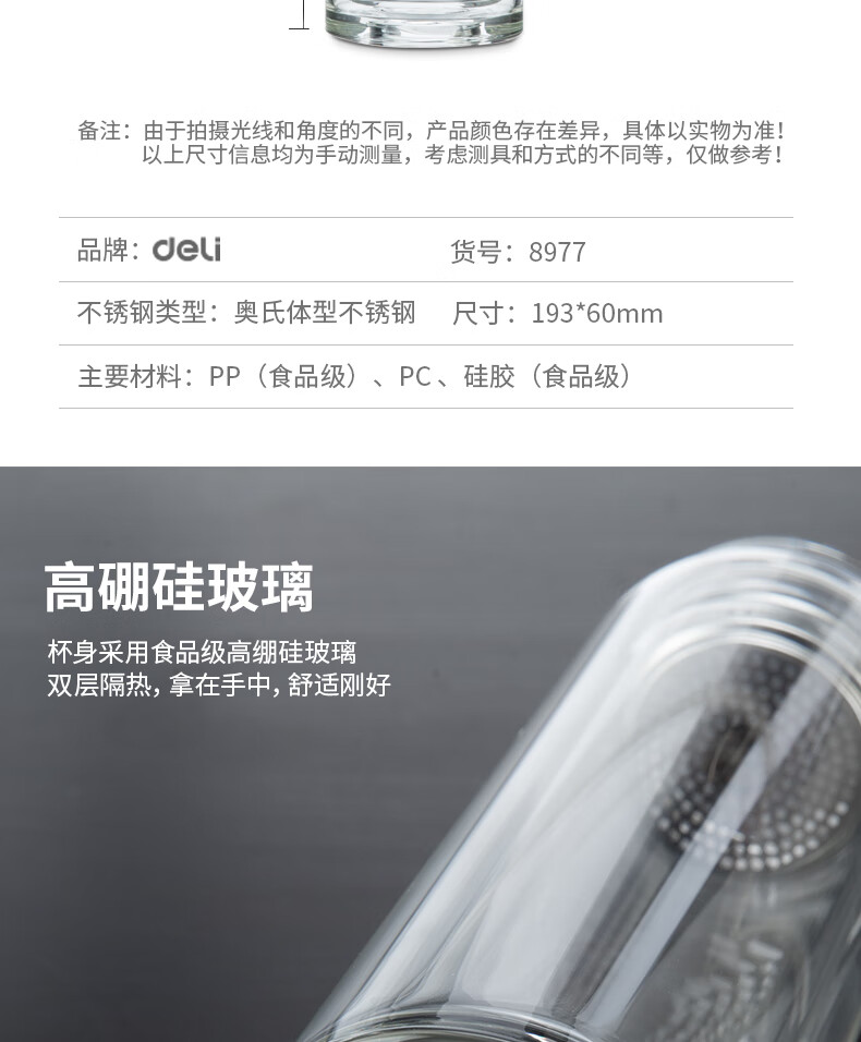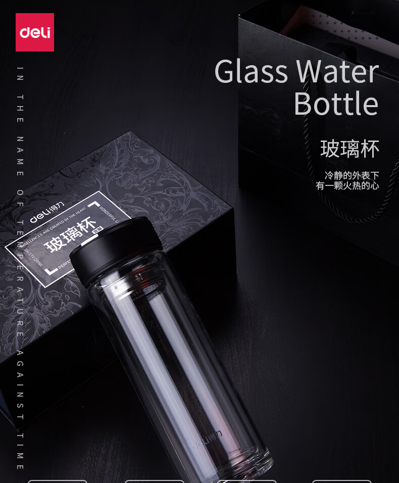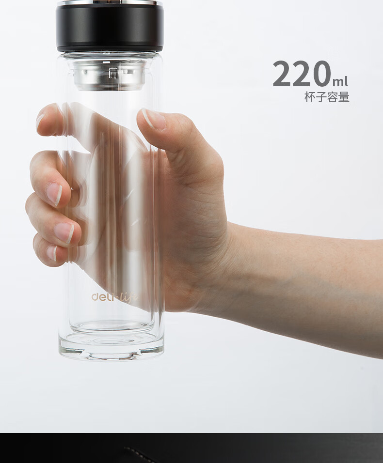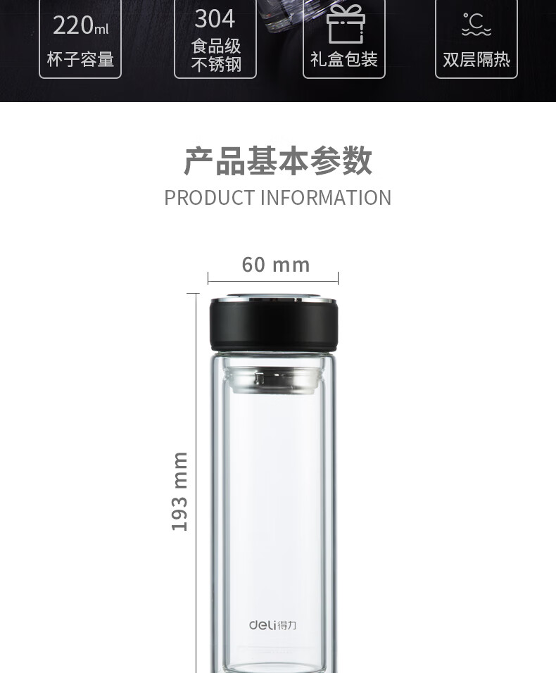 “deli/得力”No.8977 玻璃杯 單個裝(黑色蓋子鋅合金氧化220ml雙層保溫杯)