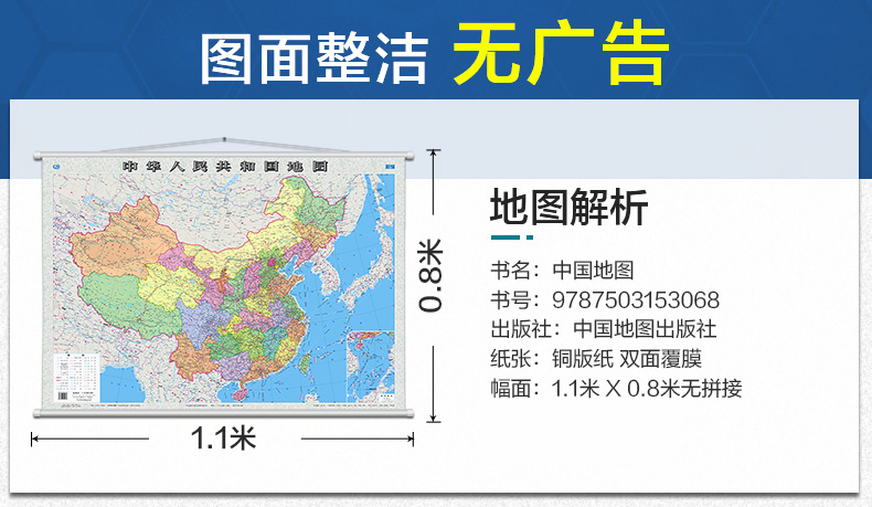 “Sinomap press/中國地圖出版社”1.1米*0.8米 中華人民共和國地圖 單幅裝(升級精裝版學(xué)生辦公室書房家庭裝飾掛圖無拼縫)