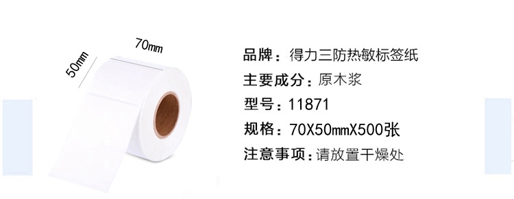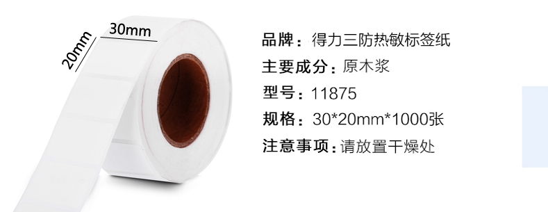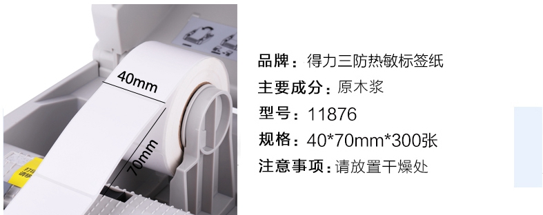 “deli/得力”No.11876 三防熱敏標簽紙 單卷裝(白色萊茵河長效不干膠打印紙條碼紙辦公用品40*70mm 300張/卷)