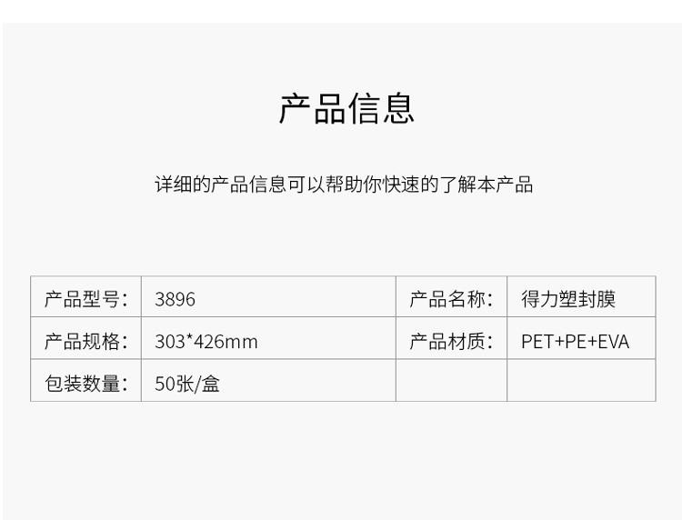 “deli/得力”No.3896 塑封膜 1盒裝(白色高透照片文件菜單過塑保護(hù)膜80mic護(hù)卡膜A3 50張/盒)