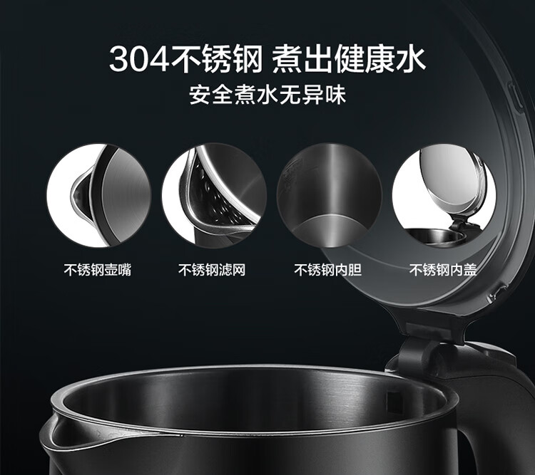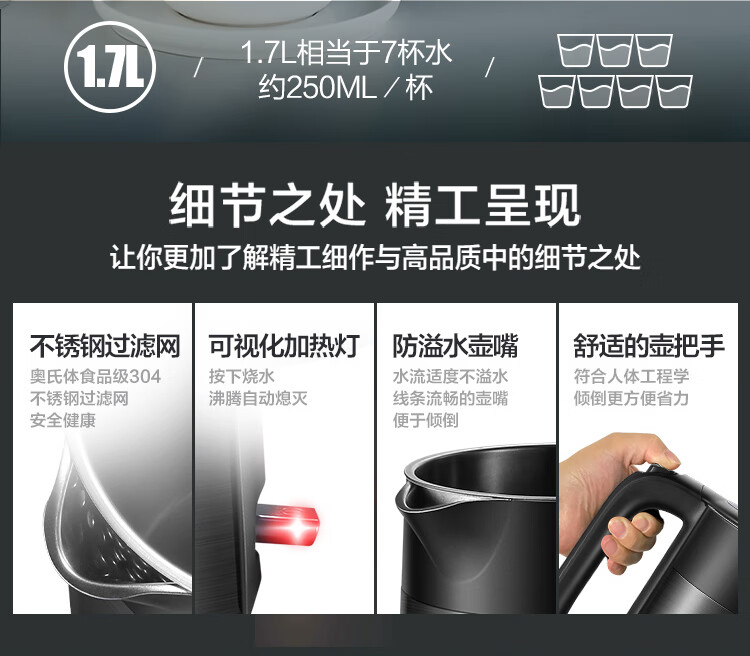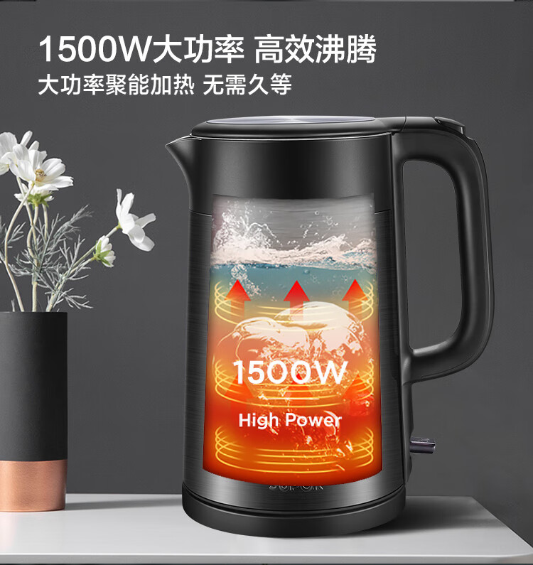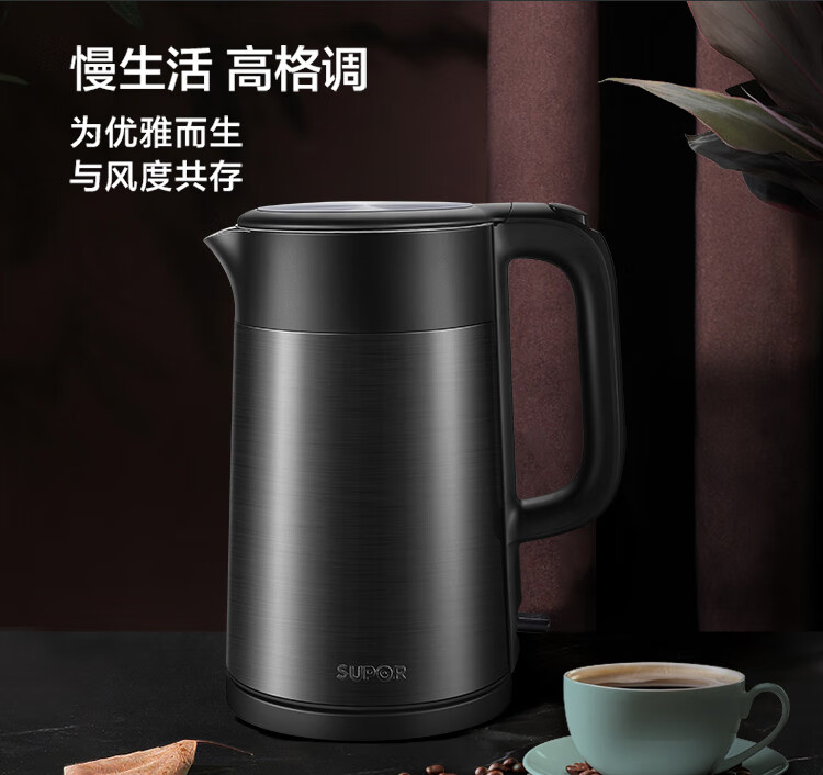 “SUPOR/蘇泊爾”SW-17S32A 電水壺 單個(gè)裝(黑色1.7L大容量ZMD安心系列酷炫雙鋼機(jī)身雙層無(wú)縫內(nèi)膽電熱水壺)