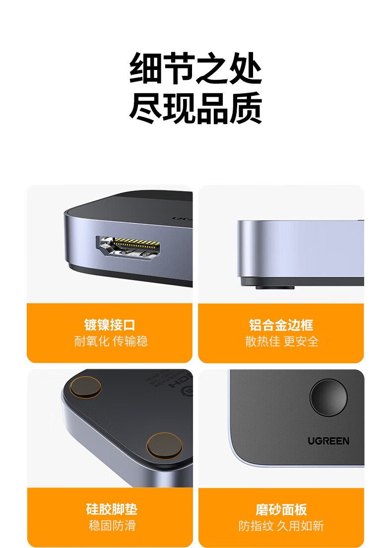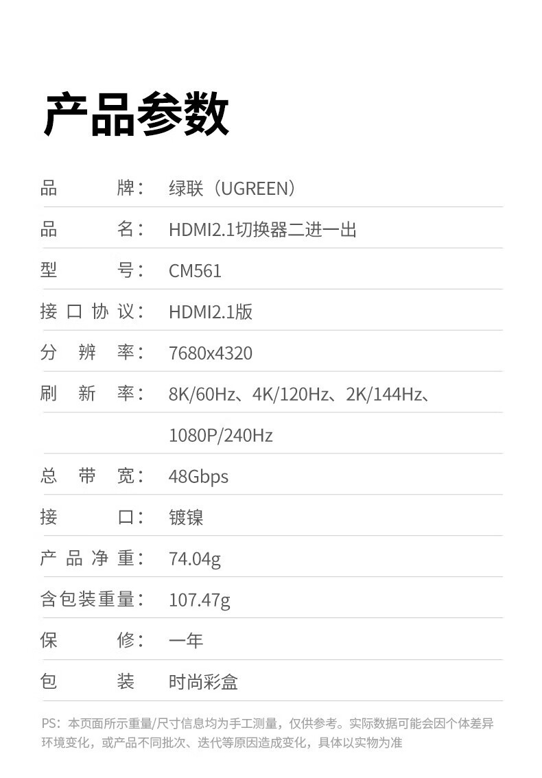 “UGREEN/綠聯(lián)”CM561 90385 HDMI2.1切換器 單個裝(2進1出高清切屏器接投影共享顯示器支持8K60Hz/4K120Hz)
