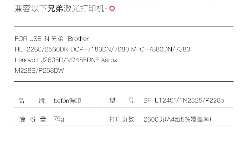 | 適用機(jī)型 | DCP-7080;7080D;7180DN;MFC-7380;7480D;7880DN;HL-L2300D;L2305W;L2315DW;L2320D;L2340;L2360;L2380;DCP-L2520;L2540DW;MFC-L2680;L2685D;L2700D;L2705;L2707;L2720;L2740DW;LJ2405D;2455D;M228DB;M228FB;M228Z;P228DB;M268DW;M268Z;P268B;P268DW;2600P;3000MF;3080MF;300D;301DN 302DNF; |