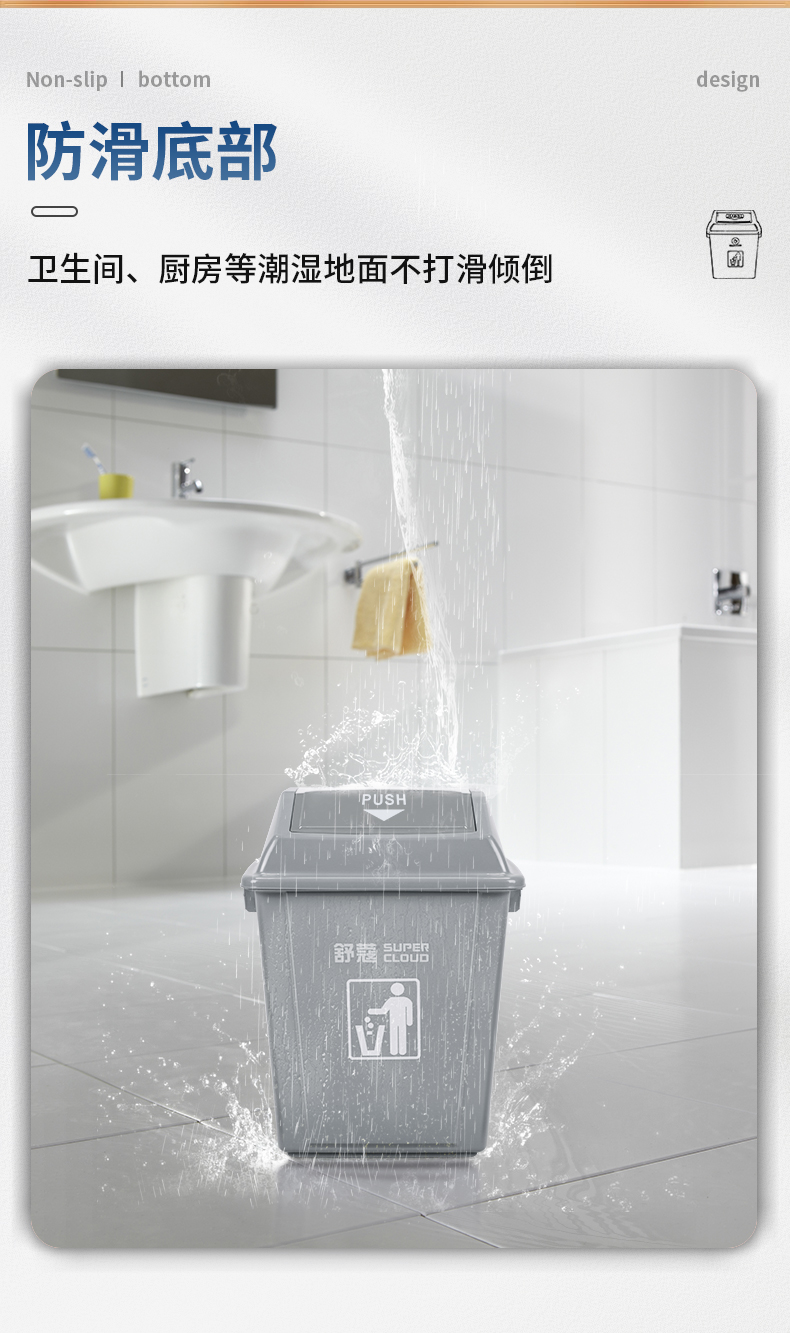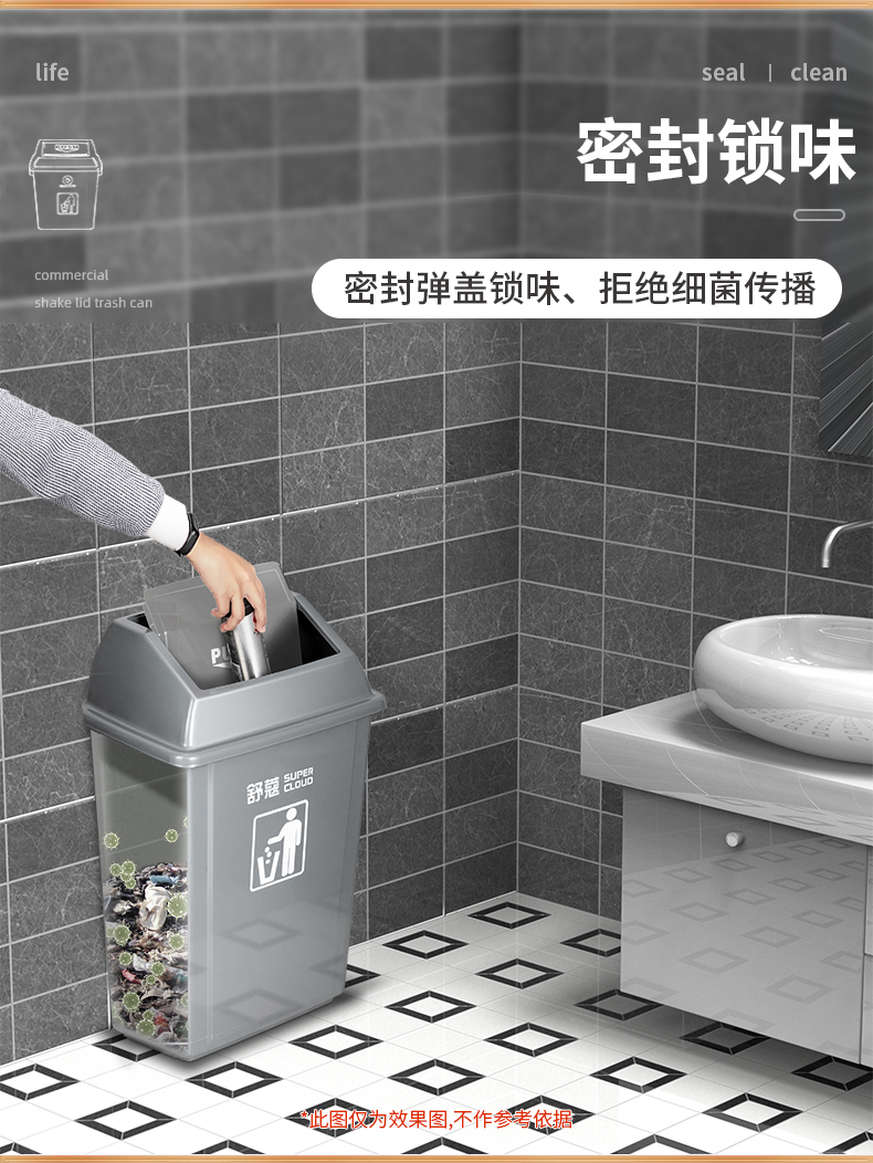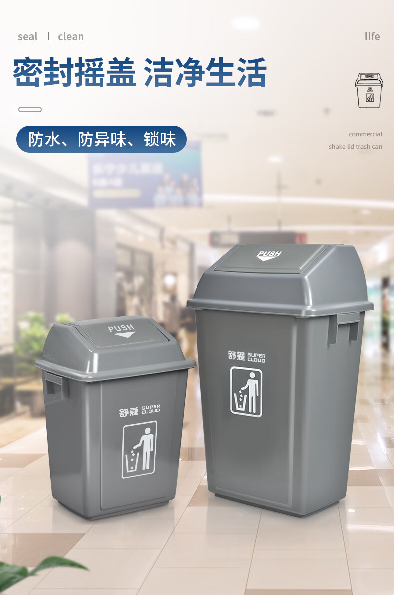 “Supercloud/舒蔻”SK-0623-58L 垃圾桶 單個裝(灰色帶蓋大號客廳廚房衛(wèi)生間廁所塑料翻蓋酒店大堂商用辦公室搖蓋)
