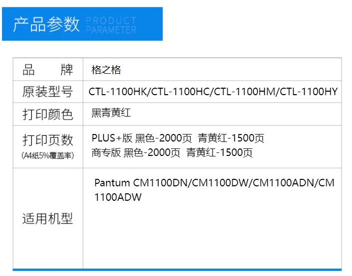 “G&G/格之格”CTL-1100HC 商用專業(yè)版 激光碳粉盒 1個(gè)裝(青藍(lán)色NT-CP1100XC適用于Pantum CM1100DN/CM1100DW商專版大容量1500頁高品質(zhì))
