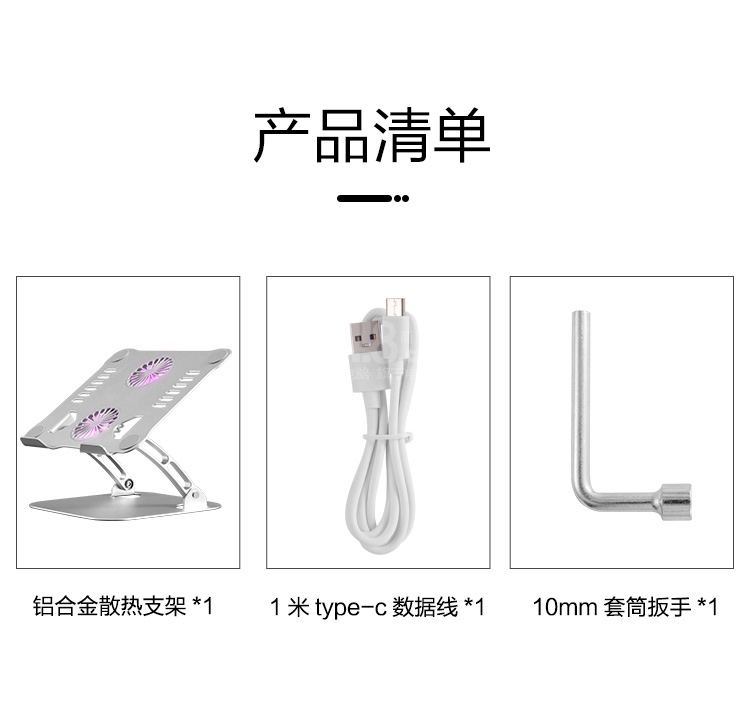 筆記本散熱器支架1PCS,數(shù)據(jù)線1PCS,氣泡袋1PCS,彩盒1PCS,合格證1PCS,鈑手1PCS