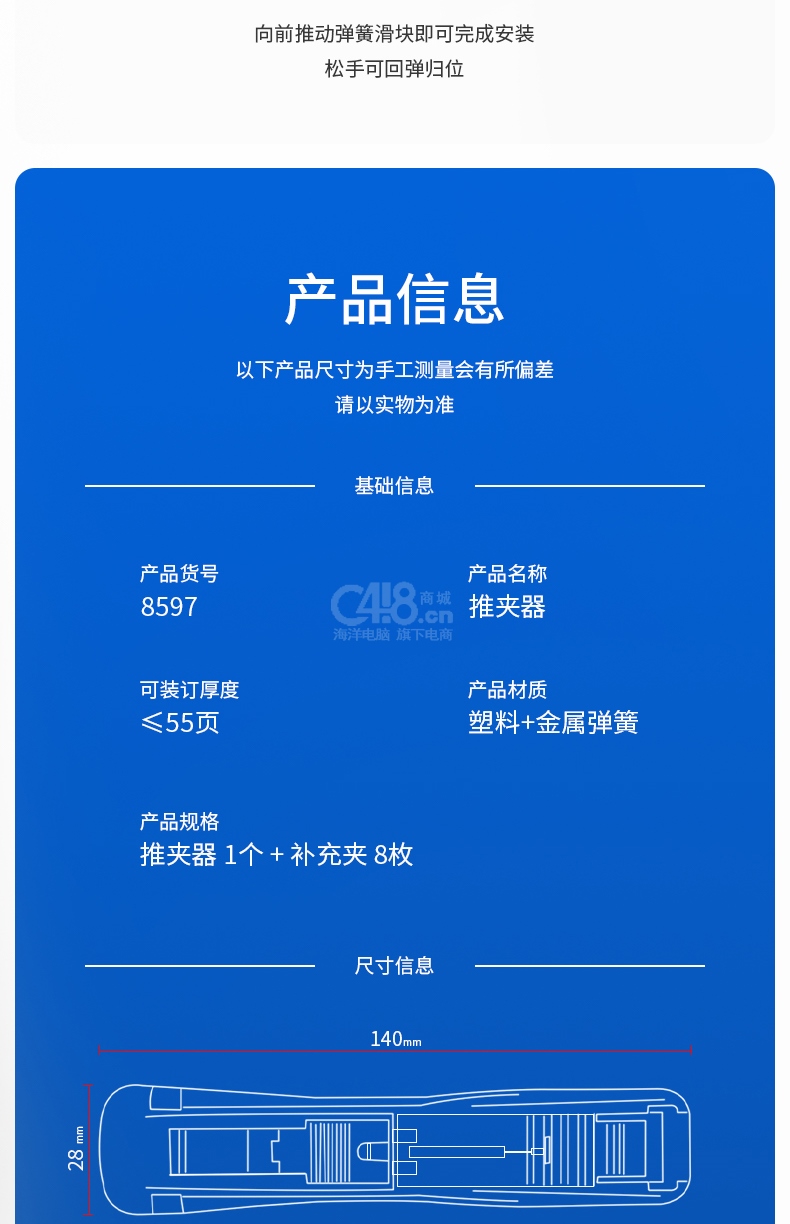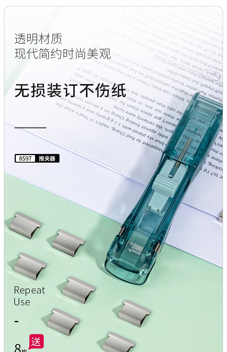 “deli/得力”No.8597 推夾器 單個裝(透明藍學(xué)生辦公便攜裝訂器可夾紙張數(shù)55張)