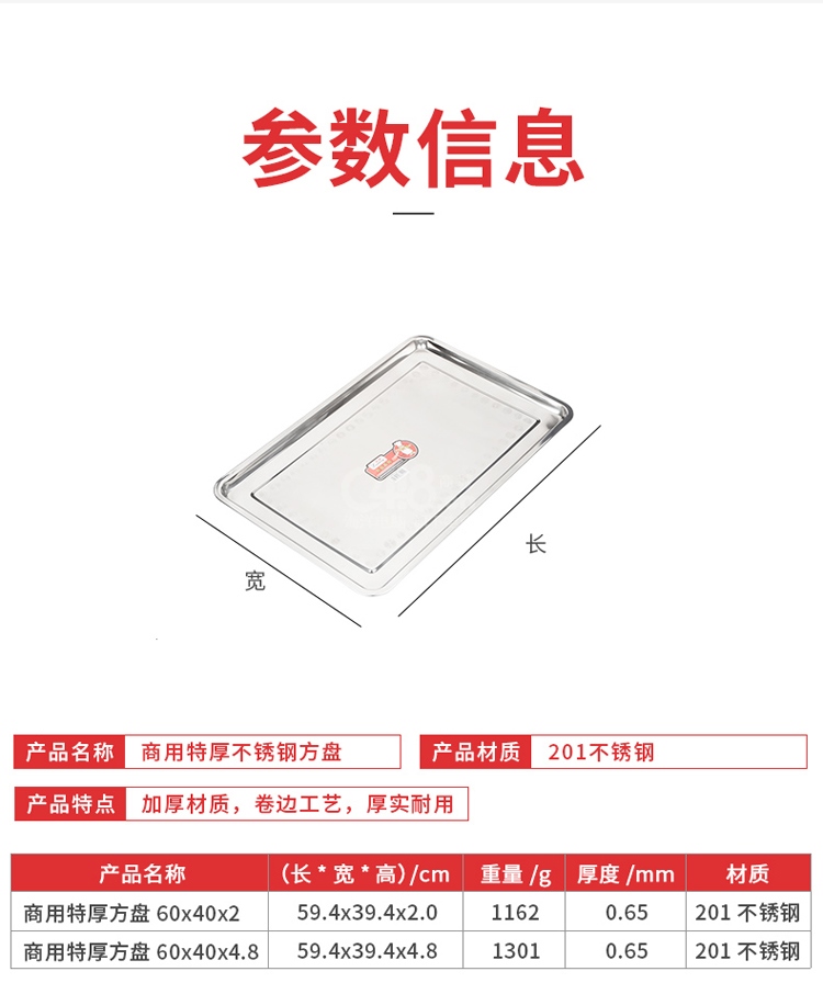 “JOBO/巨博”FP6040488G 不銹鋼托盤(pán) 單個(gè)裝(長(zhǎng)方形無(wú)磁特厚方盤(pán)烤箱烤盤(pán)烤魚(yú)盤(pán)60x40x4.8cm)
