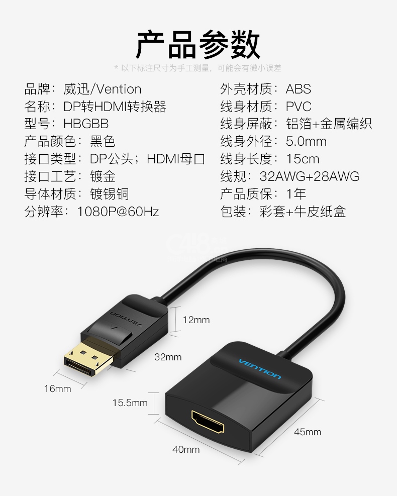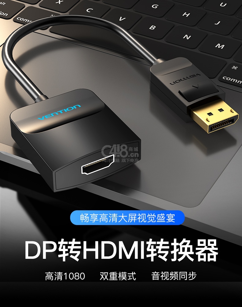 “VENTION/威迅”HBGBB DP轉(zhuǎn)HDMI轉(zhuǎn)換器 單個(gè)裝(黑色0.15米高清DisplayPort轉(zhuǎn)hdmi轉(zhuǎn)換頭臺式機(jī)電腦接電視顯示器轉(zhuǎn)接線)