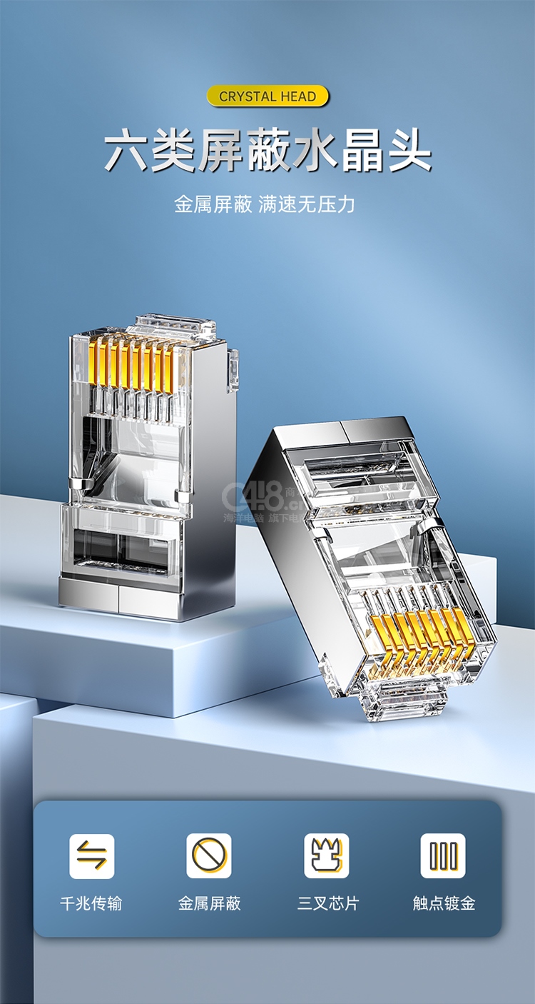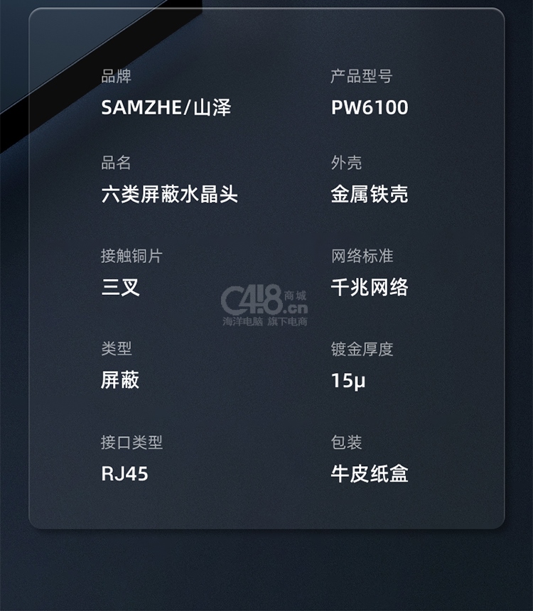 “SAMZHE/山澤”PW6100 六類屏蔽水晶頭 單個(gè)裝(工程6類千兆網(wǎng)絡(luò)連接器Cat6帶屏蔽電腦網(wǎng)線RJ45接頭鍍金100個(gè)/盒)