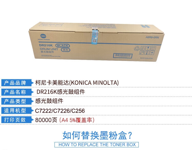 “KONICA MINOLTA/柯尼卡美能達(dá)”DR216K BLACK 感光鼓組件 單個裝(黑色原裝硒鼓感光鼓組件單元適用C7222/C7226/C256打印機(jī)印量102000頁)