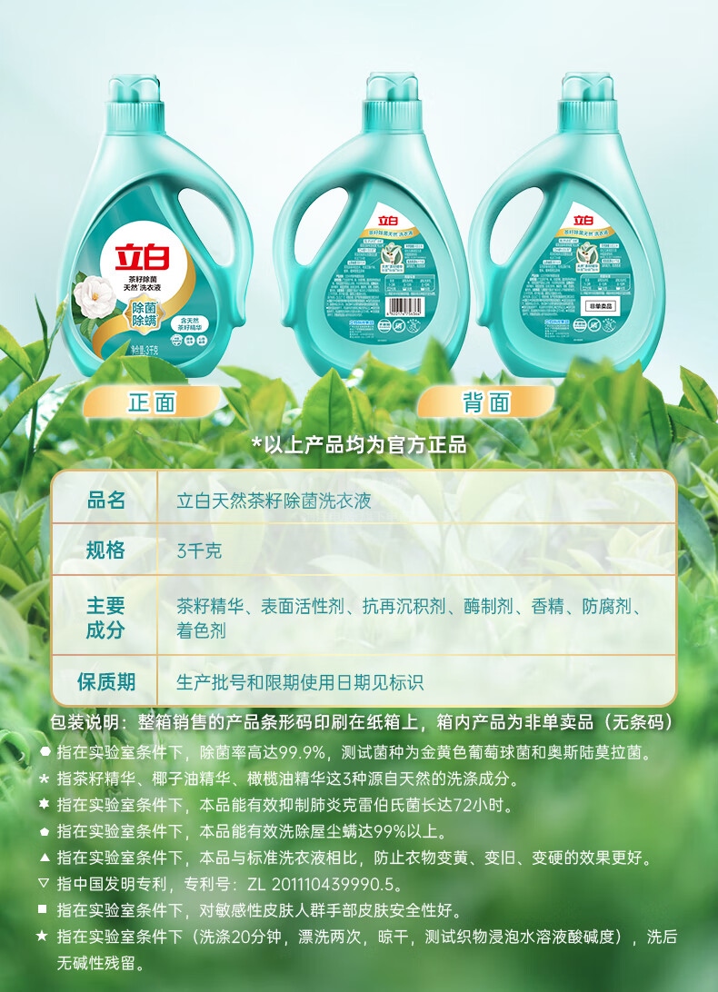 “l(fā)iby/立白”茶籽除菌 3千克 天然洗衣液 單桶裝(3kg除螨抑菌手洗機洗祛味去漬兒童適用)