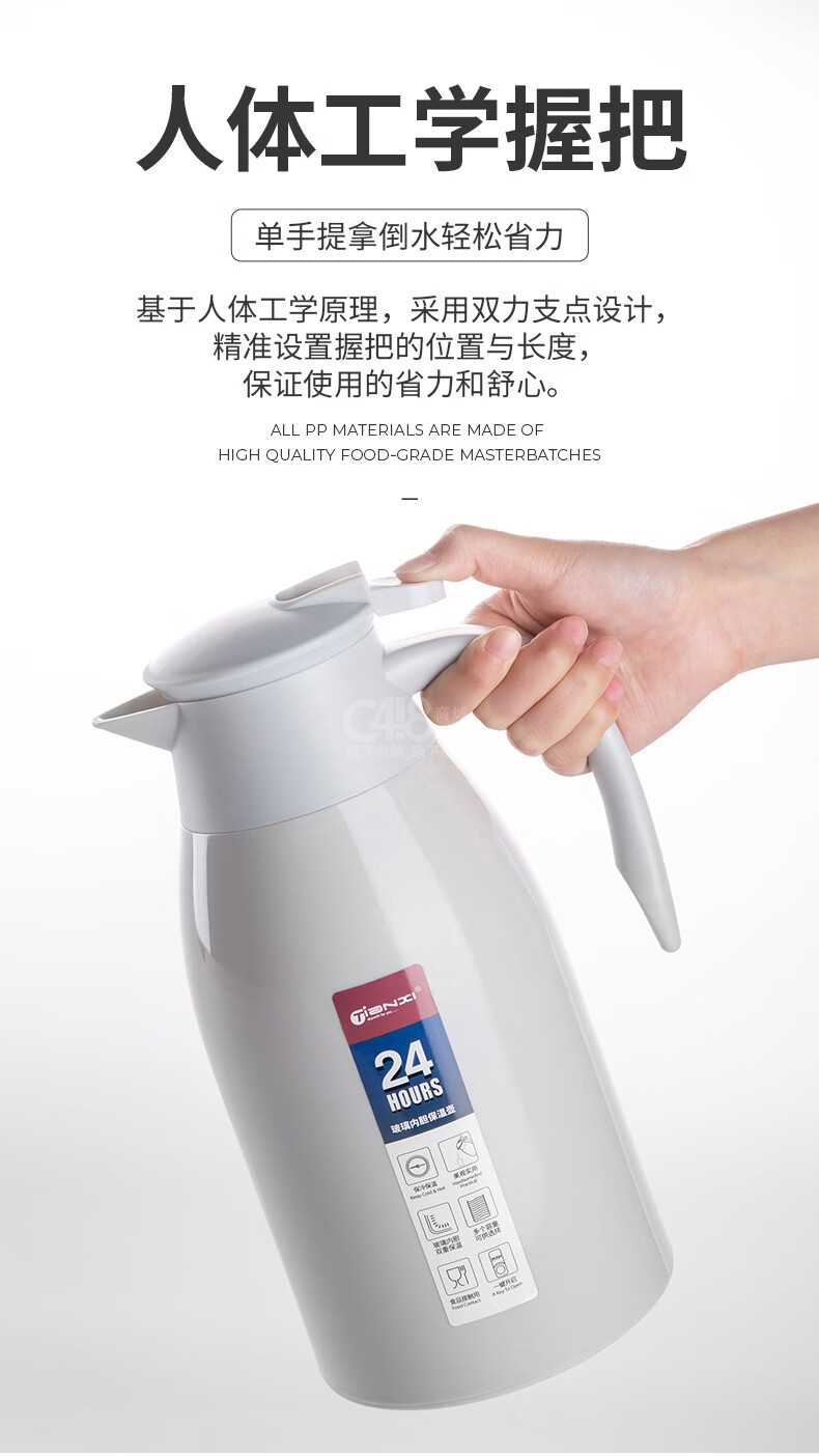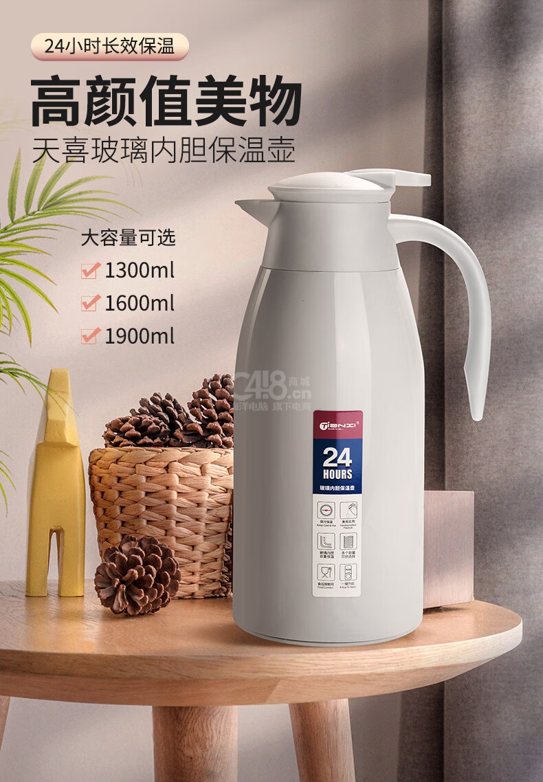 “TIANXI/天喜”TBB142-1900 保溫壺 單個裝(絲綢灰1.9L玻璃內(nèi)膽家用大容量暖水壺辦公熱水瓶開水暖瓶)