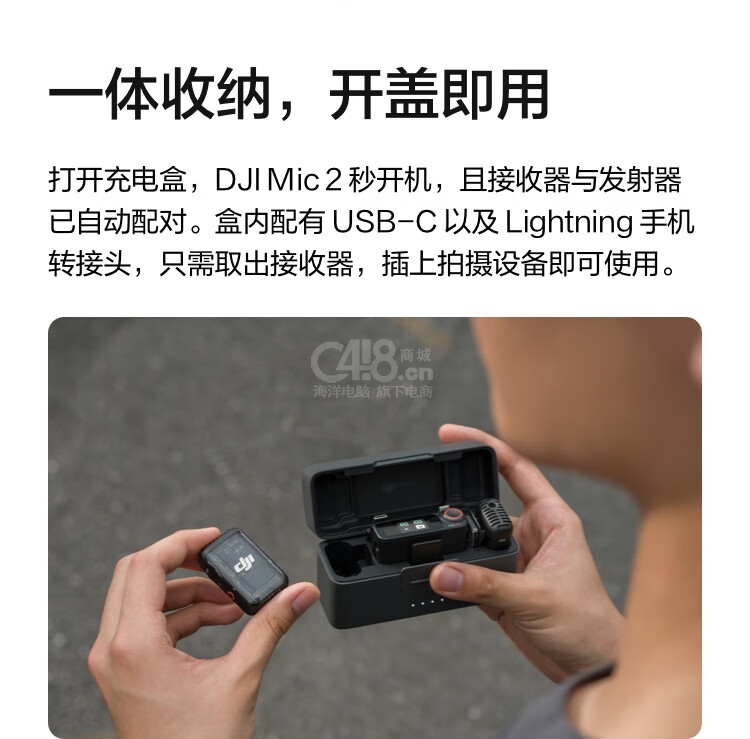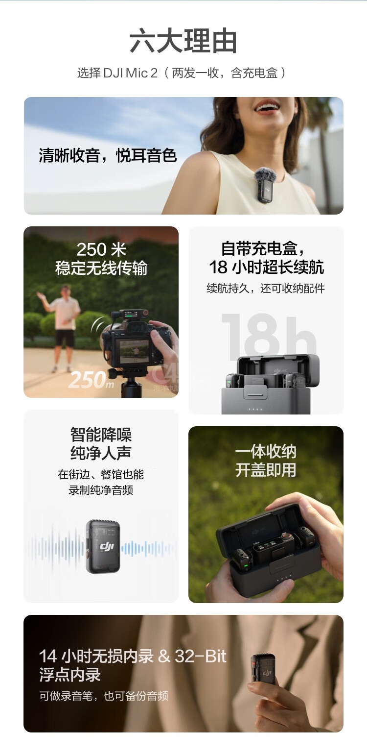 DJI Mic 2 接收器 ×1,DJI Mic 2 發(fā)射器(透明黑) ×2,DJI Mic 2 充電盒 ×1,DJI Mic 2 相機(jī)連接線(3.5 毫米 TRS) ×1,DJI Mic 2 手機(jī)連接頭(Type-C 接頭) ×1,DJI Mic 2 手機(jī)連接頭(Lightning 接頭) ×1,DJI Mic 2 防風(fēng)毛套 ×2,DJI Mic 2 背夾磁鐵 ×2,DJI Mic USB-C 充電線 ×1,DJI Mic 2 收納包 ×1