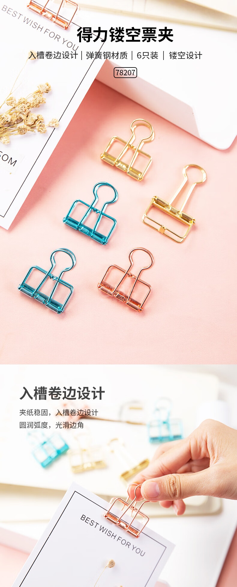 “deli/得力”No.78207 長(zhǎng)尾票夾 單袋裝(藍(lán)色玫瑰金金色3號(hào)32mm長(zhǎng)尾夾鏤空彩色票夾錢夾6枚/袋3袋/組)