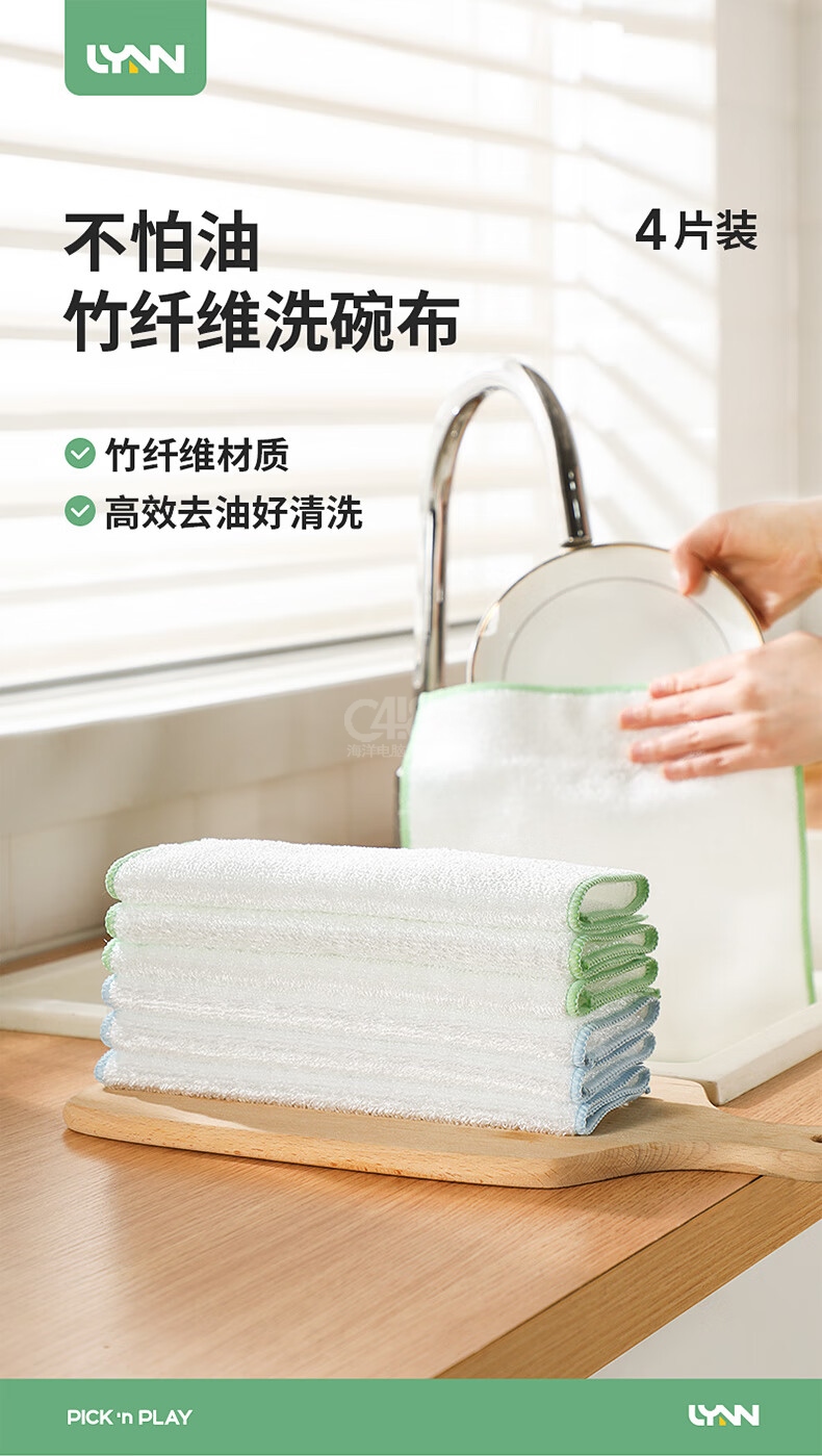 “LYNN”LN33068 竹纖維抹布 單塊裝(顏色隨機(jī)廚房去油污洗碗布百潔布不易沾油不掉毛刷鍋神器4塊/組)