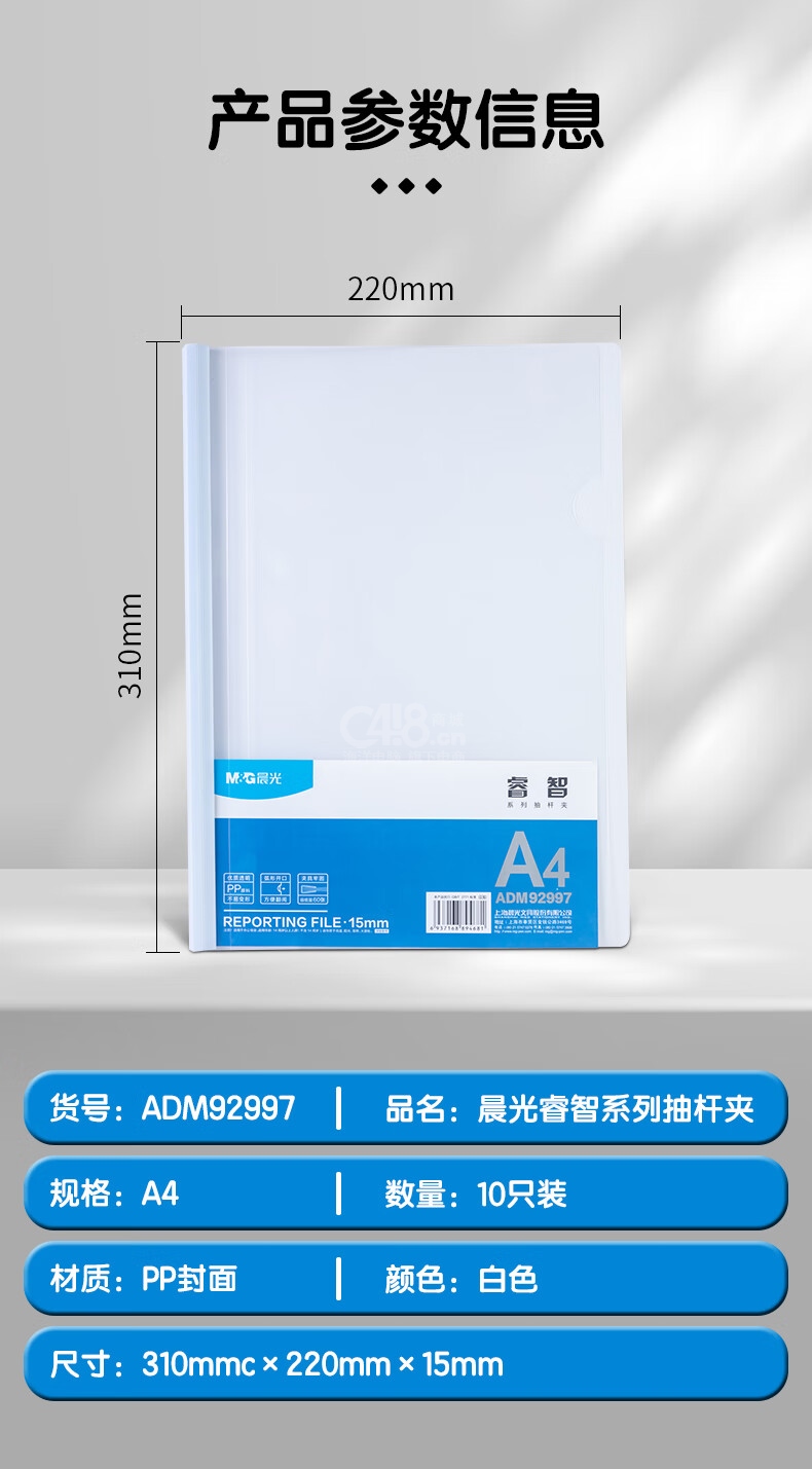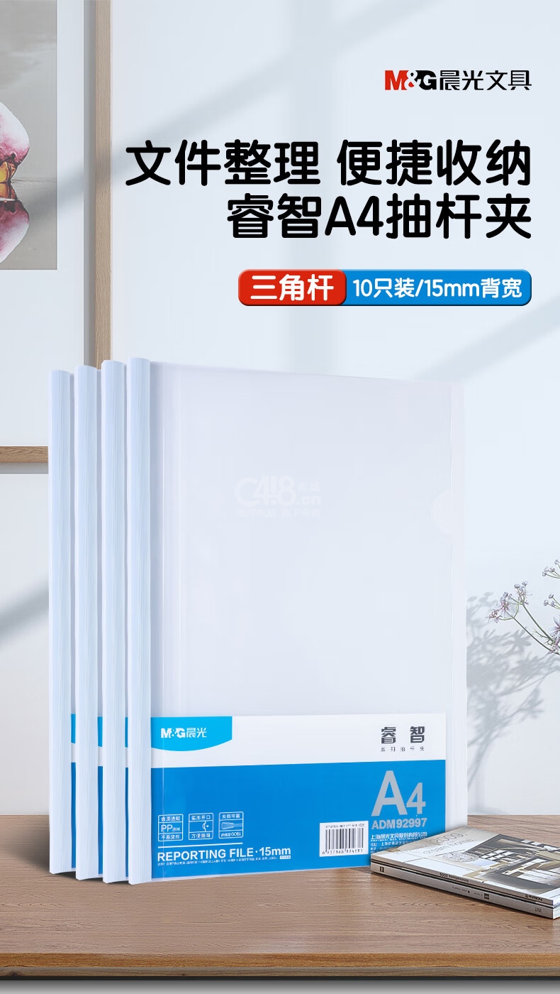 晨光(M&G)文具A4/15mm透明抽桿夾 10個(gè)裝 辦公報(bào)告夾拉桿夾 睿智系列資料整理收納文件夾ADM92997