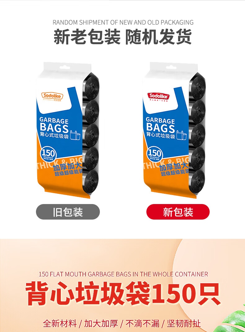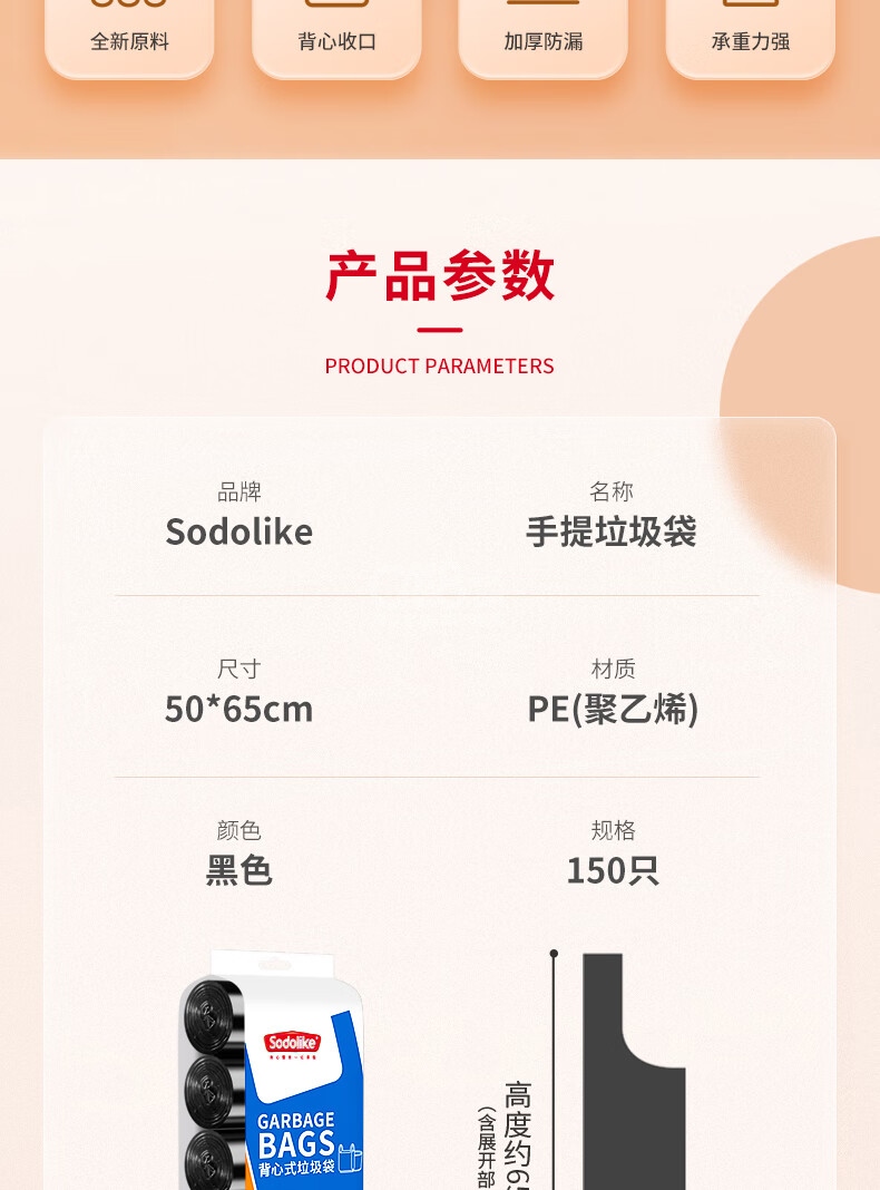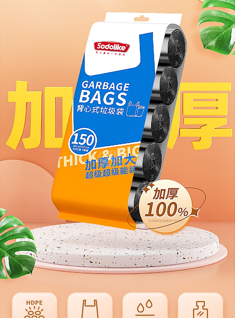 “sodolike/尚島宜家”50*65cm 手提垃圾袋 1捆裝(黑色背心手提式垃圾袋/廚房用超厚150只/大號(hào)5卷)