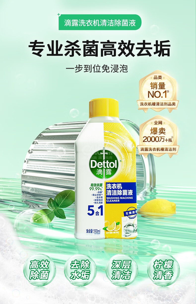 “Dettol/滴露”檸檬清新 250mL 洗衣機清潔除菌液 單瓶裝(滾筒波輪洗衣機清潔劑強力除垢除菌除霉清洗劑)
