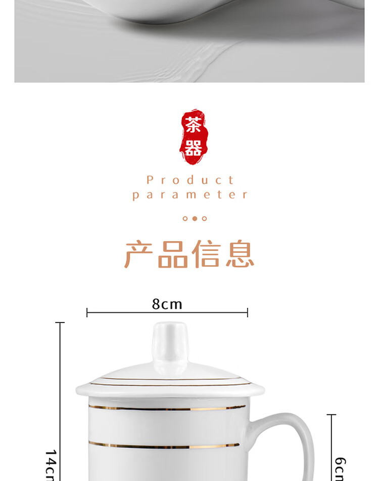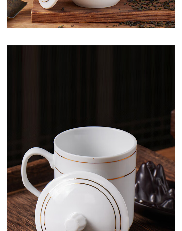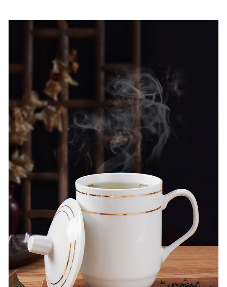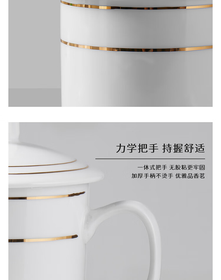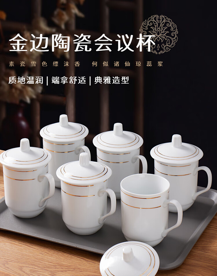 “Baijie/拜杰”金邊360ml 茶杯 1個裝(辦公室陶瓷杯會議杯金邊帶蓋商務開會杯子水杯6個/套)