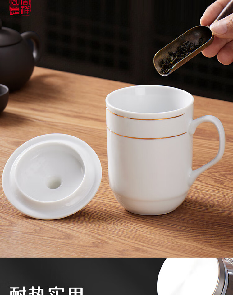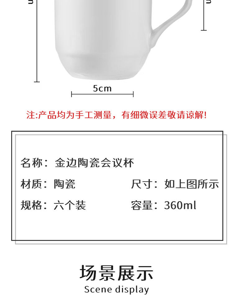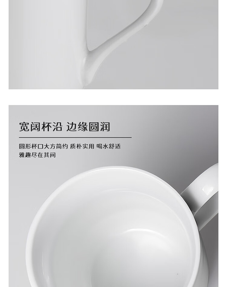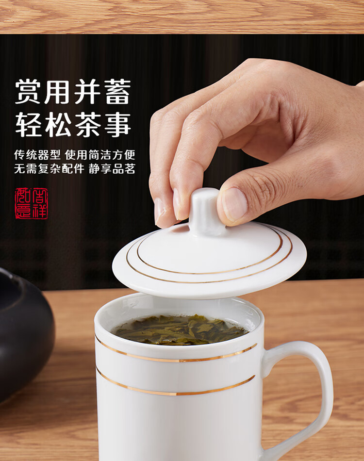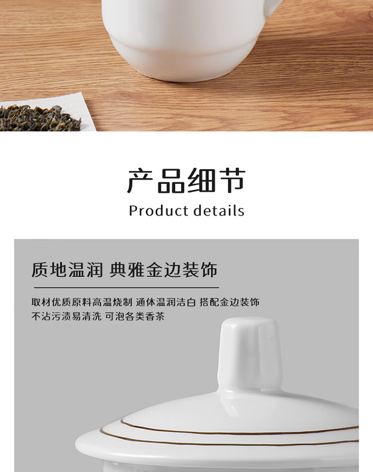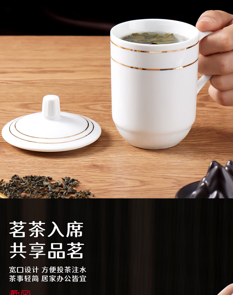 “Baijie/拜杰”金邊360ml 茶杯 1個裝(辦公室陶瓷杯會議杯金邊帶蓋商務開會杯子水杯6個/套)