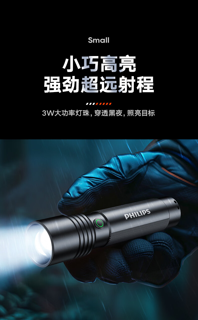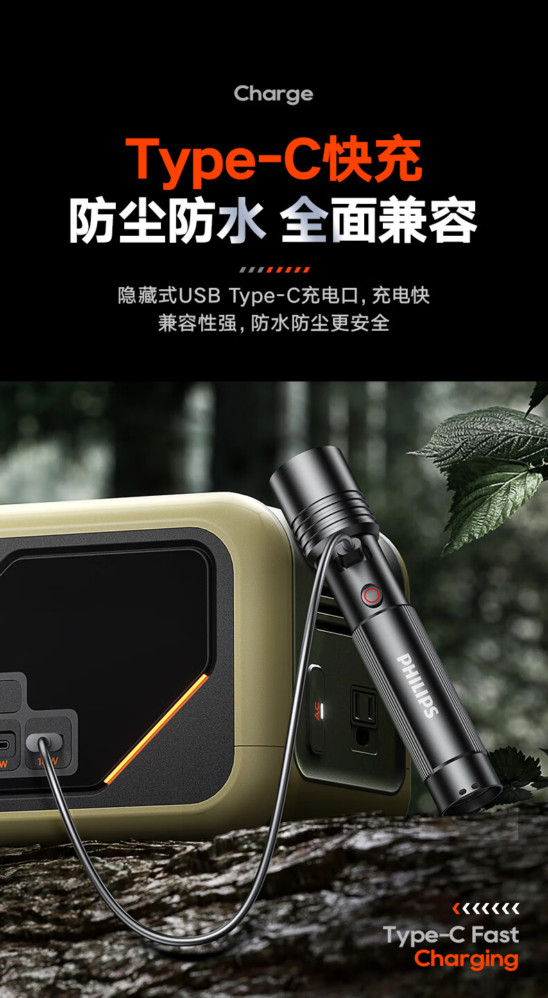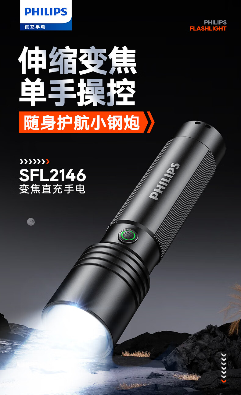 “PHILIPS/飛利浦”SFL2146/93 直充手電 單個(gè)裝(強(qiáng)光手電筒變焦超亮Type-C充電小型戶外露營(yíng)燈應(yīng)急)