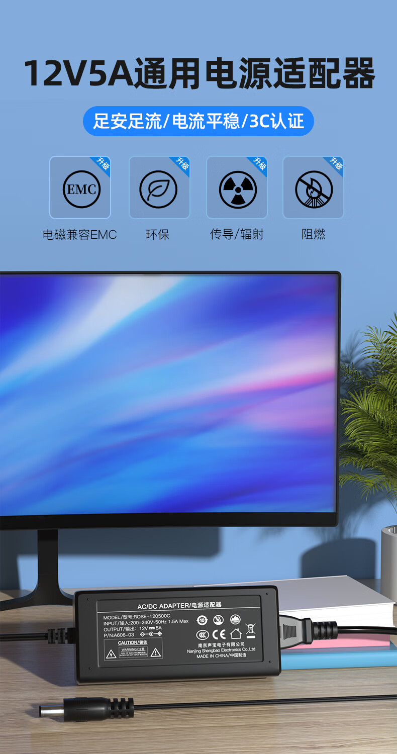 “SNBMW/金陵聲寶”ROSE-120500C 電源適配器 單個裝(LED液晶顯示器電源適配器監(jiān)控攝像頭硬盤盒電源線HKC打印機按摩椅充電器5.5*2.5mm)