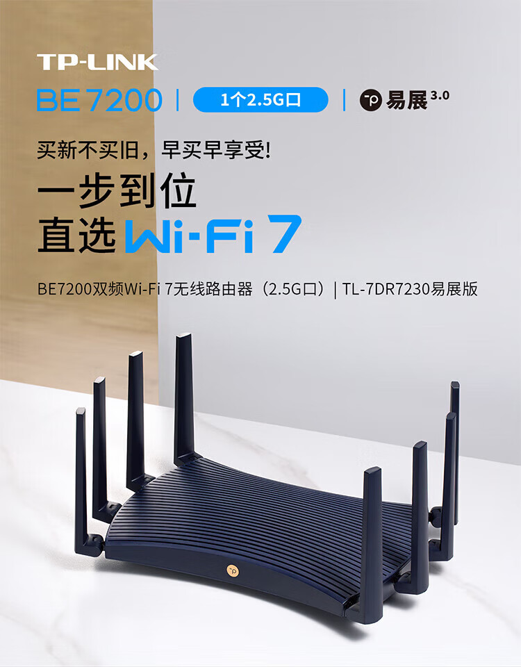 “TP-LINK/普聯(lián)”TL-7DR7230易展版 路由器 1臺(tái)裝(BE7200雙頻千兆Wi-Fi 7無(wú)線路由器2.5G網(wǎng)口/mesh電競(jìng)路由游戲加速/上網(wǎng)行為管理)