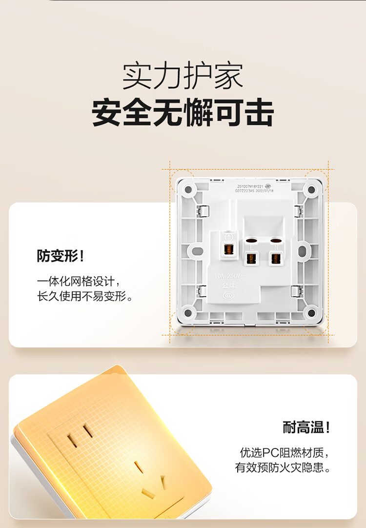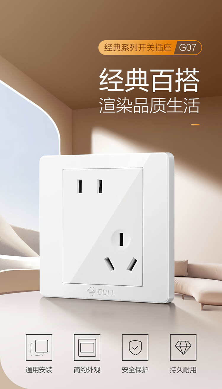“BULL/公?!盙07Z223AS 開(kāi)關(guān)插座 單個(gè)裝(白色G07系列10A斜五孔插座86型插座面板)